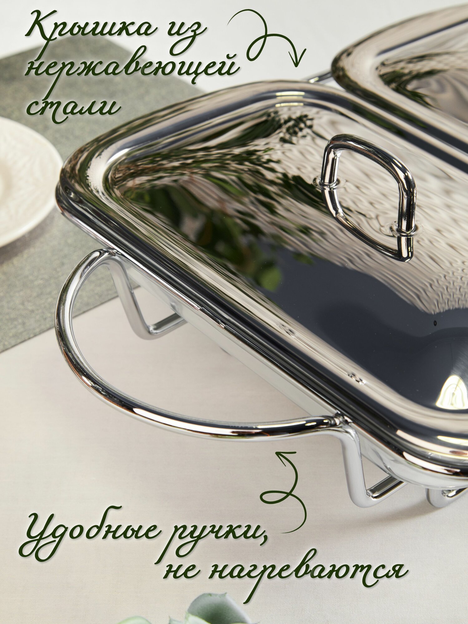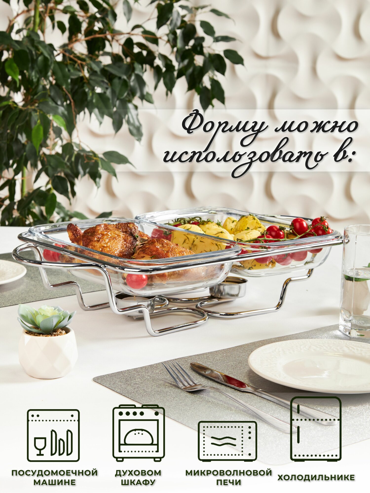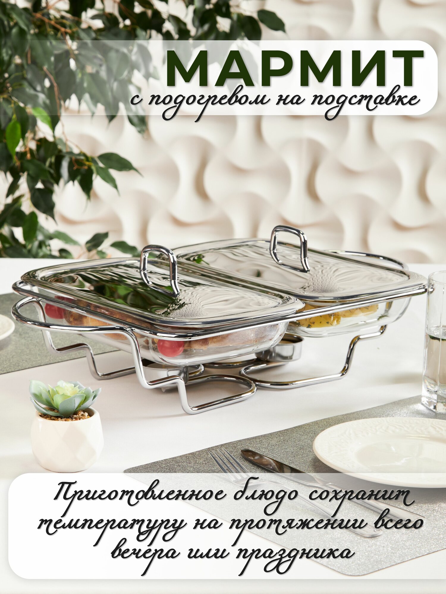 Мармит - прямоугольное стеклянное блюдо с крышкой для сервировки, хранения и подогрева пищи. Это удобная, красивая и многофункциональная посуда, которая станет украшением вашей кухни. Два прямоугольных блюда подходит для сервировки стола, запекания в духовке и хранения пищи. Объем формы - 2 x 1,5 литра, размеры - 50,5x29,5 см, высота 16 см. Стеклянный глубокий противень с подогревом от свечи - специальная подставка предназначена для подогрева курицы, мяса, овощей или рыбы и поддержания температуры продолжительное время. Блюда на подставке с подогревом позволит еде не остыть и остаться горячей на протяжении всего обеда. Такое сервировочное стеклянное блюдо с крышкой и свечой - прекрасный вариант для застолий и фуршетов, когда необходимо обеспечить подачу горячей пищи. Стеклянная прямоугольная форма подходит для духовки и приготовления в ней блюд благодаря жаропрочному стеклу (максимальная температура нагрева до 260 градусов). Стекло инвентаря устойчиво к внешнему воздействию и подходит для посудомоечной машинки, а хромированную подставку необходимо мыть вручную.