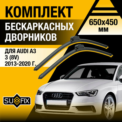 Бескаркасные автомобильные дворники 650/450мм SUFIX, набор из 2 шт от официального дилера бренда легко устанавливаются на крепление Узкая кнопка (Narrow Push Button) и идеально подходят для автомобиля марки Audi A3 (3) 8V 2013, 2014, 2015, 2016, 2017, 2018, 2019, 2020 года выпуска. Этот комплект щеток стеклоочистителя обеспечивает беспроблемную работу и отличную очистку стекла вашего автомобиля.