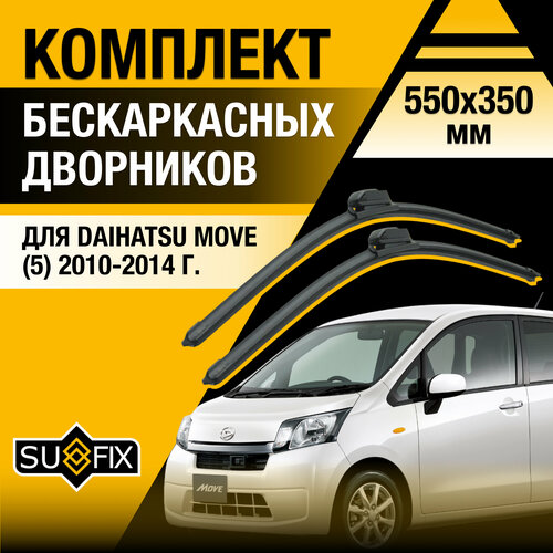 Бескаркасные автомобильные дворники 550/350мм SUFIX, набор из 2 шт от официального дилера бренда легко устанавливаются на крепление Крючок (Hook / J-Hook) и идеально подходят для автомобиля марки Daihatsu Move (5) LA100, LA110 2010, 2011, 2012, 2013, 2014 года выпуска. Этот комплект щеток стеклоочистителя обеспечивает беспроблемную работу и отличную очистку стекла вашего автомобиля.