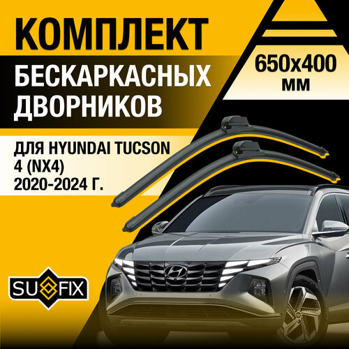 Бескаркасные автомобильные дворники 650/400мм SUFIX, набор из 2 шт от официального дилера бренда легко устанавливаются на крепление Крючок (Hook / J-Hook) и идеально подходят для автомобиля марки Hyundai Tucson (4) NX4 2020, 2021, 2022, 2023, 2024, 2025 года выпуска. Этот комплект щеток стеклоочистителя обеспечивает беспроблемную работу и отличную очистку стекла вашего автомобиля.