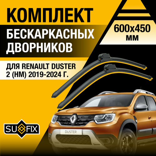 Бескаркасные автомобильные дворники 600/450мм SUFIX, набор из 2 шт от официального дилера бренда легко устанавливаются на крепление Штыковой замок (Bayonet arm) и идеально подходят для автомобиля марки Renault Duster (2) HM 2020, 2021, 2022, 2023, 2024, 2025 года выпуска. Этот комплект щеток стеклоочистителя обеспечивает беспроблемную работу и отличную очистку стекла вашего автомобиля.