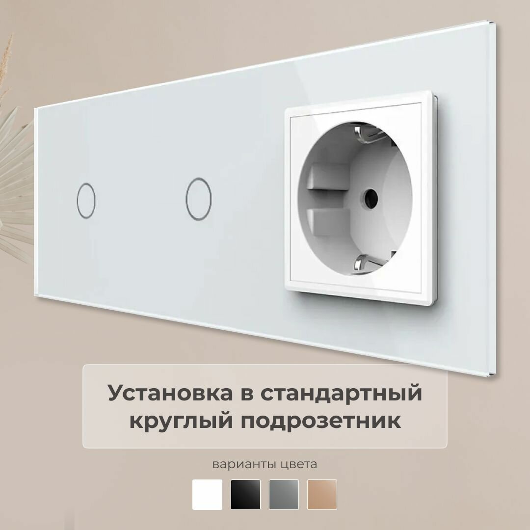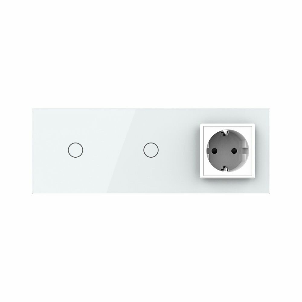 Двухклавишный сенсорный выключатель Livolo с розеткой белый на 3 поста для управления двумя линиями нагрузки (ВКЛ/выкл). Чувствительный сенсор, моментальное включение. При переключении издаётся лёгкий щелчок. Подсветка клавиш светится синим при выключенном свете, красным при включённом. Переделывать проводку не нужно (только фазный провод, без нуля). Работает со всеми типами ламп. Максимальная нагрузка 1000 Ватт на клавишу. Для корректной работы с лампами мощностью менее 5 Ватт может потребоваться адаптер для маломощных ламп.
