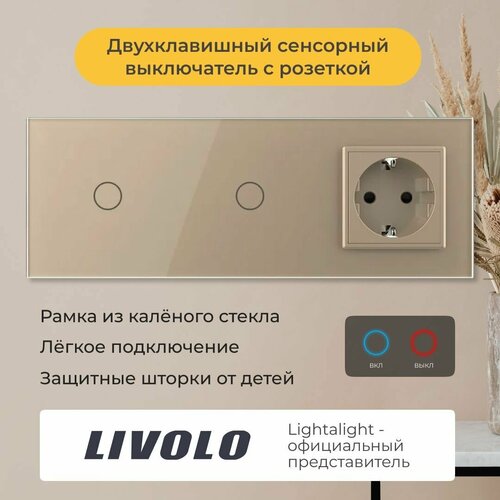 Двухклавишный сенсорный выключатель Livolo с розеткой золотой на 3 поста для управления двумя линиями нагрузки (ВКЛ/выкл). Чувствительный сенсор, моментальное включение. При переключении издаётся лёгкий щелчок. Подсветка клавиш светится синим при выключенном свете, красным при включённом. Переделывать проводку не нужно (только фазный провод, без нуля). Работает со всеми типами ламп. Максимальная нагрузка 1000 Ватт на клавишу. Для корректной работы с лампами мощностью менее 5 Ватт может потребоваться адаптер для маломощных ламп.