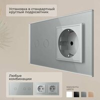 Двухклавишный сенсорный выключатель Livolo с розеткой серый на 2 поста для управления двумя линиями нагрузки (ВКЛ/выкл). Чувствительный сенсор, моментальное включение. При переключении издаётся лёгкий щелчок. Подсветка клавиш светится синим при выключенном свете, красным при включённом. Переделывать проводку не нужно (только фазный провод, без нуля). Работает со всеми типами ламп. Максимальная нагрузка 1000 Ватт на клавишу. Для корректной работы с лампами мощностью менее 5 Ватт может потребоваться адаптер для маломощных ламп.