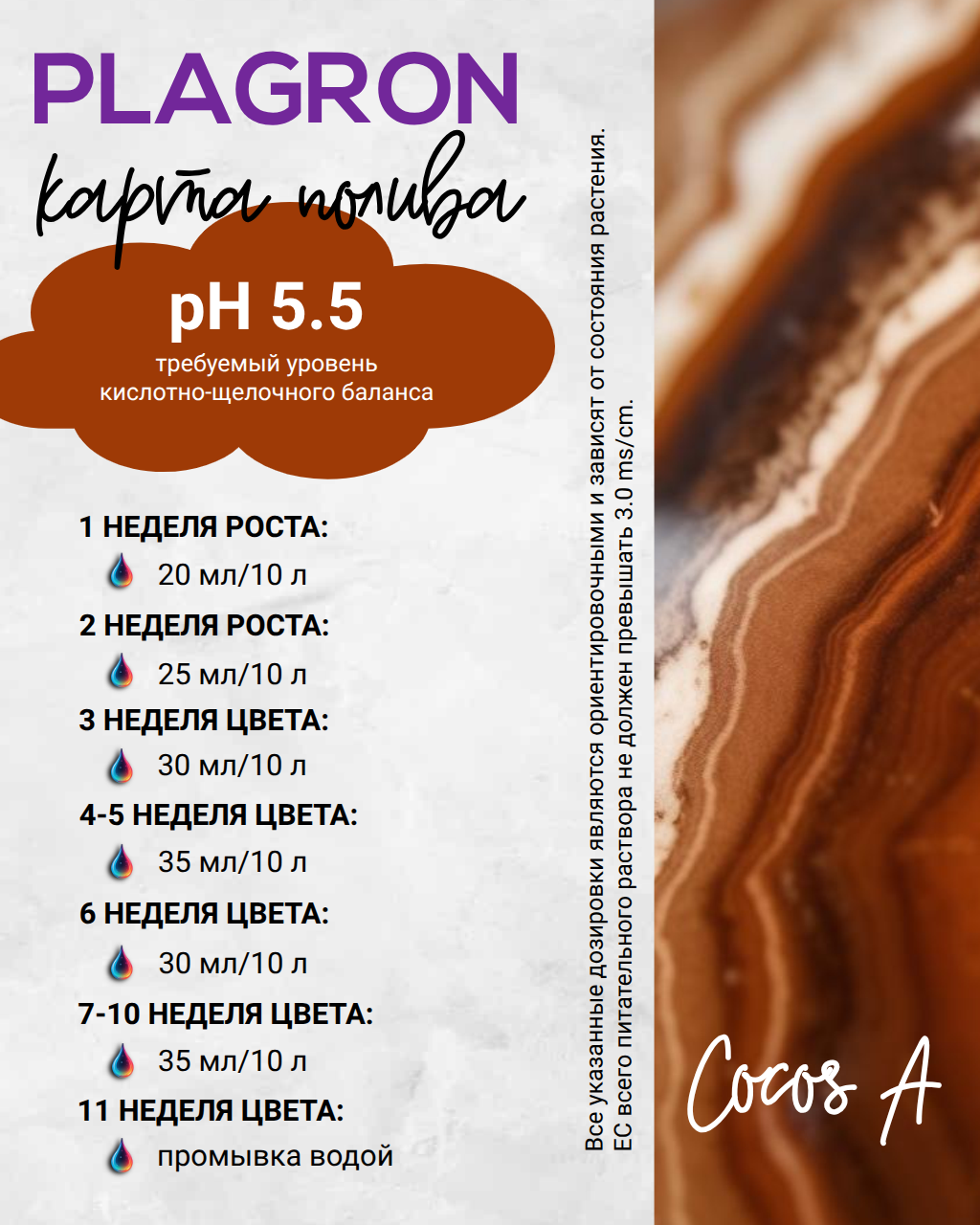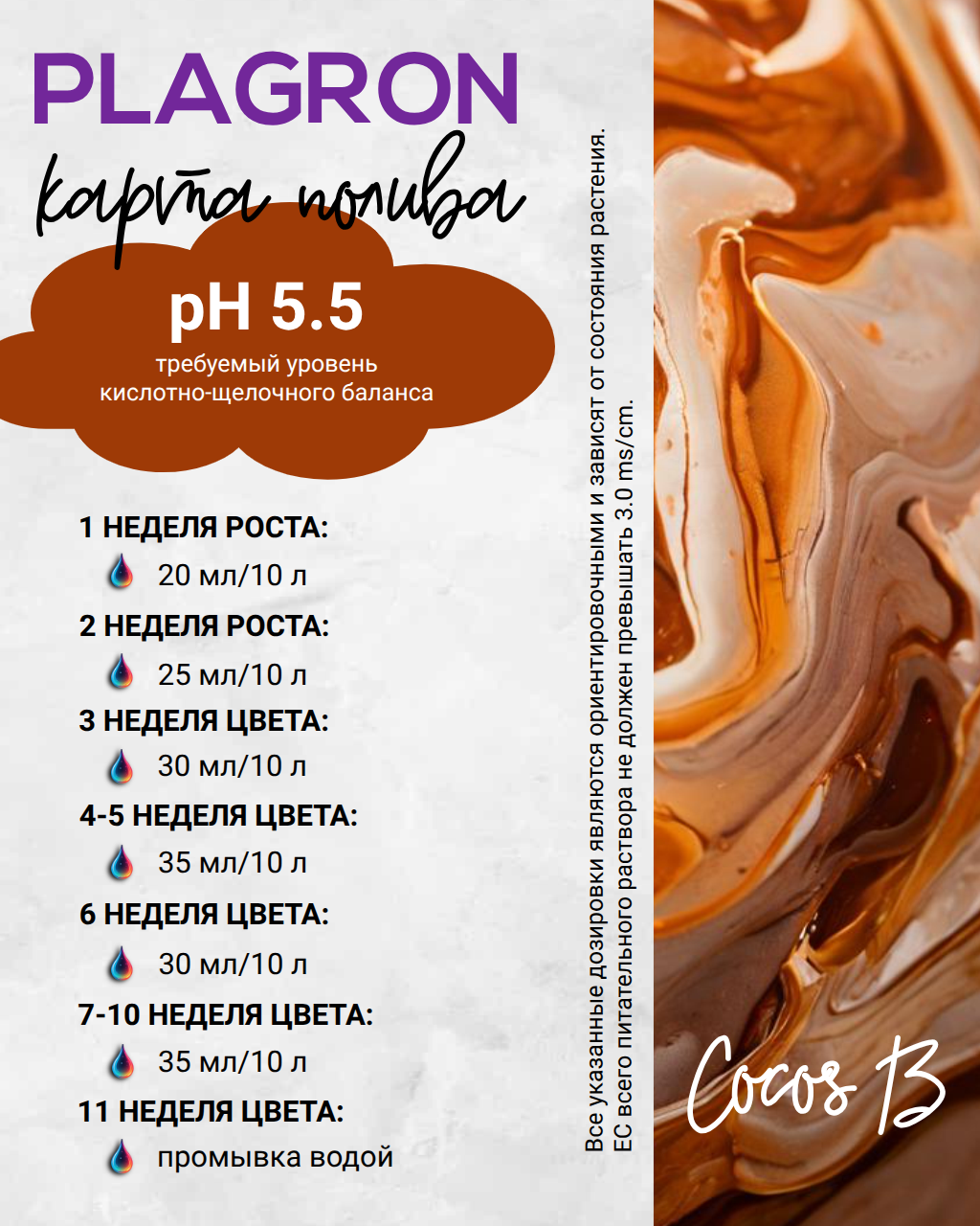 Plagron является одним из ведущих мировых производителей удобрений, его продукция пользуется большим спросом благодаря своему высокому качеству и эффективности. Это био-минеральное удобрение используется для выращивания растений на любом кокосовом субстрате, оно может применяться на всех стадиях роста. Это двухкомпонентное удобрение выпускается в жидком виде. Состав Хелатные формы, в которых находятся микроэлементы, способствуют увеличению эффективности удобрения и препятствуют выпадению осадка. Эффективность Благодаря хорошей сбалансированности питательных компонентов удобрение дает отличный результат. Оно может применяться на протяжении всей жизни растения, удобрение одинаково эффективно и на фазе роста, и на фазе цветения. Средство не кристаллизуется, не выпадает осадок. Оно стабильно как при высокой кислотности, так и при высоких щелочных показателях. Оно может использоваться с любыми системами полива растений. Применение удобрения На один литр воды добавляется один-четыре мл средства, точная доза зависит от потребностей вашего растения. Средство необходимо использовать во время каждого полива, перед употреблением его необходимо хорошо взболтать. Регулярное использование поможет вам добиться отличных результатов.