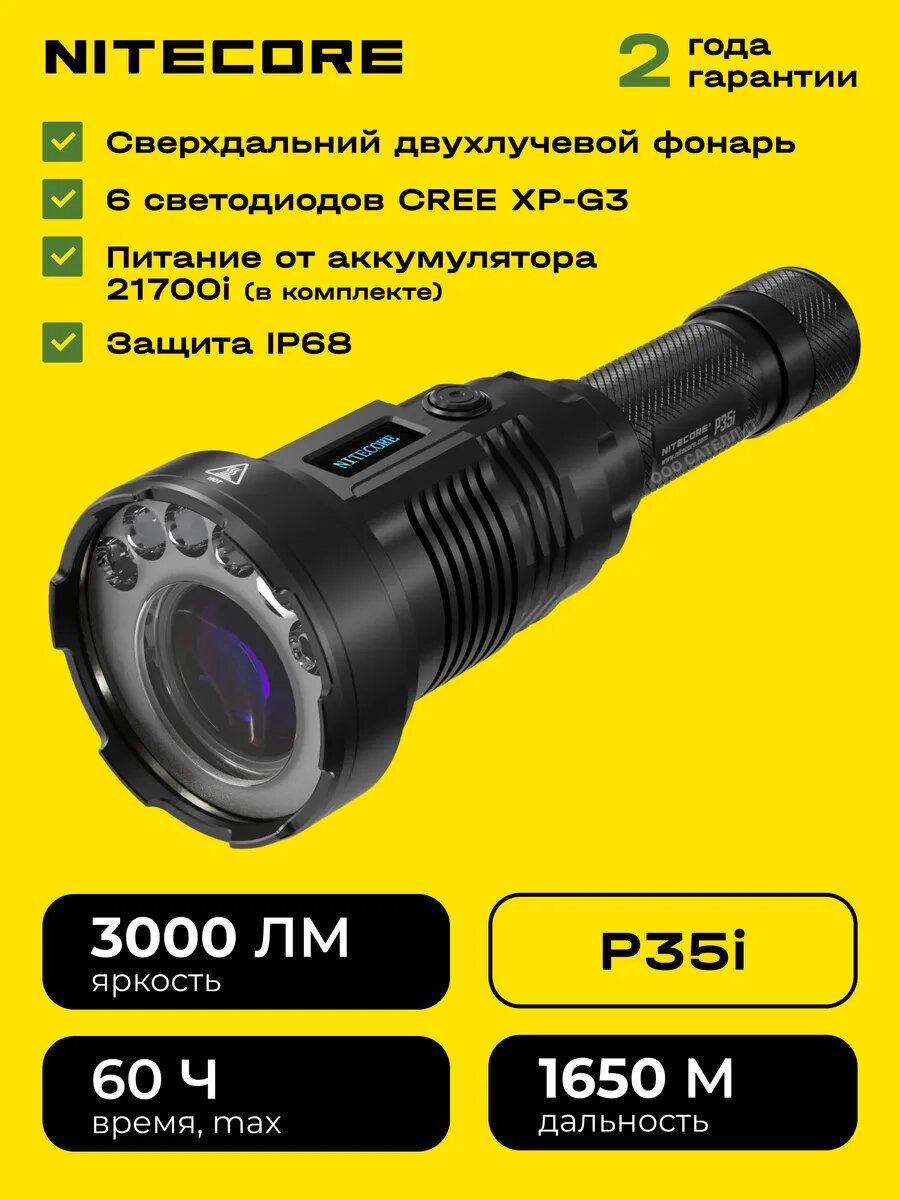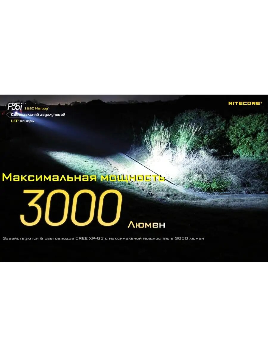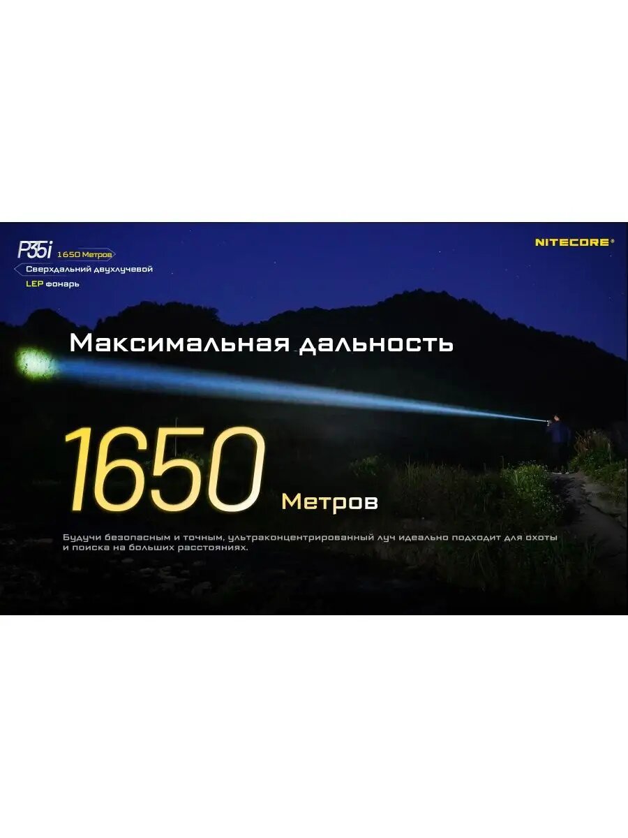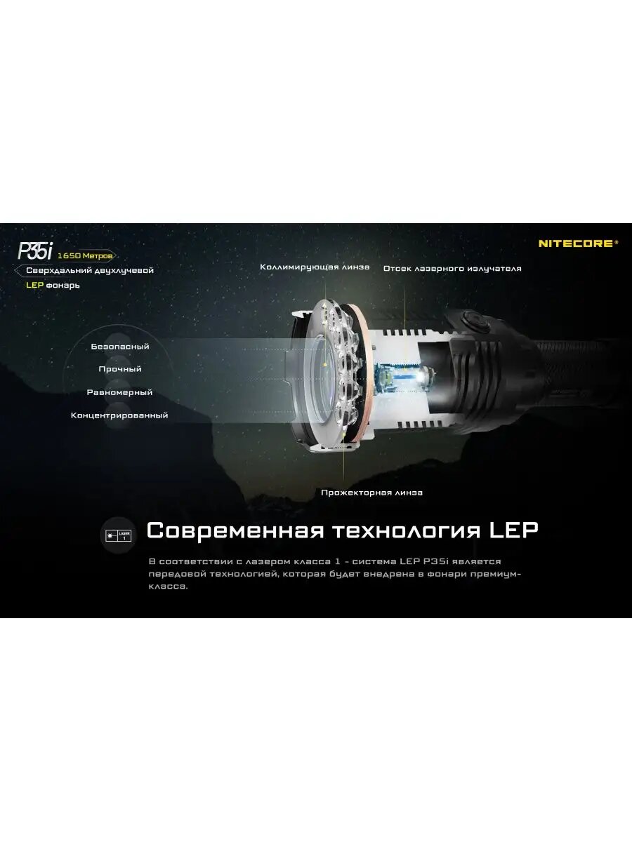 Подствольный тактический лазерный фонарь NiteCore P35i от компании (Найткор) работает на одном дальнобойном источнике света Lazer LEP мощностью 410 люмен и дальностью светового потока 1650 метров и шести дополнительных светодиодах Cree XP-L HD мощностью 3000 люмен. Фонарь светит лазером белого света с узким сфокусированным лучом без периферийной засветки, в котором полностью отсутствует ИК и УФ спектр. Фонарь оснащен Li-ion аккумулятором 21700 емкостью 5000 мАч, который обеспечивает ультра длительное время работы, а также тактической кнопкой в хвосте фонаря для мгновенной активации. Благодаря индикации заряда, остаточная энергия аккумулятора отображается каждый раз при включении фонаря.