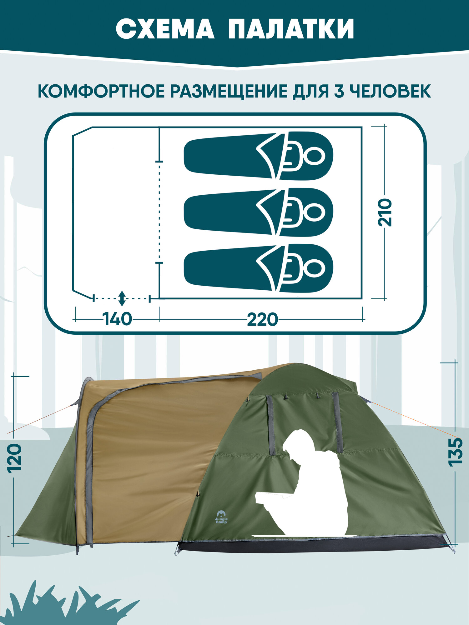 Трехместная палатка с вместительным тамбуром Jungle Camp Torino 3 - отличный выбор для любителей туризма, походов выходного дня, рыбалки с ночевкой.