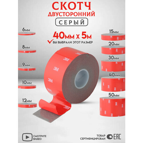 Двухсторонний скотч 3M Серый 40мм - 5 метров длинной в рулоне, выпускается различной шириной. Размер указан на картинке. Двусторонняя клейкая лента 3М - отличная альтернатива всем средствам механического соединения. Эта сверхпрочная лента, на обе стороны которой нанесён акриловый клей, позволяет надёжно закрепить детали, не нарушая целостность поверхностей! Данный скотч подходит как для внутреннего, так и для наружного промышленного применения с самыми разнообразными поверхностями. Клейкая лента 3М подходит для постоянного надежного крепления к поверхностям из окрашенной стали и различным пластикам, используемым в автомобилях, может наноситься на любые поверхности из алюминия, пластика, стали, стекла, дерева, керамики, также обладает высокой прочностью на отрыв и сдвиг, свойствами снятия напряжений между материалами.