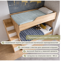 Кровать двухъярусная "Геометрия" от Астрид-Мебель - это сочетание удобства и красивого дизайна. Кровать оснащена лестницей-комодом, что особенно порадует детей. В лестнице предусмотрено четыре ниши за дверками, которые могут использоваться для хранения различных вещей. Размеры кровати с лестницей: 2258х1611х842мм ШхВхГ Спальное место:800х180см Основание: Настил ЛДСП Цвет: Делано светлый/Белый Тип направляющих: Шариковые Ручки: Белый пластик Рекомендуемая высота матраса: 18-22 см (приобретается отдельно) Максимальная нагрузка: 70 кг Сборка: Универсальная