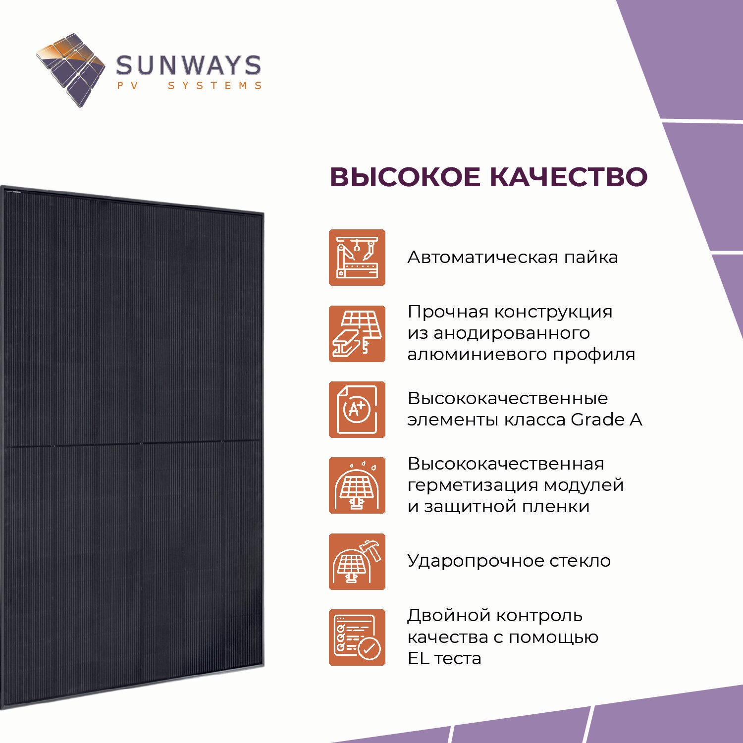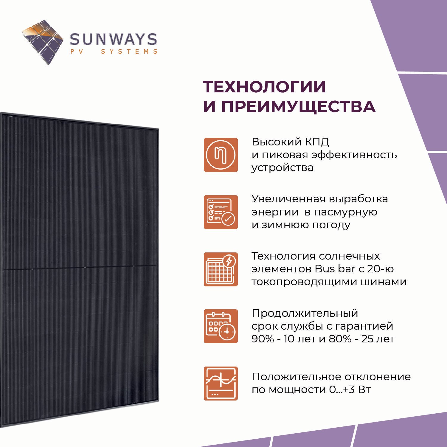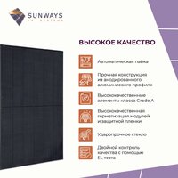 Благодаря высокому качеству материалов и комплектующих мы можем гарантировать более длительный срок эксплуатации солнечных панелей Sunways. • Срок гарантии на сборку и материалы составляет 12 лет.