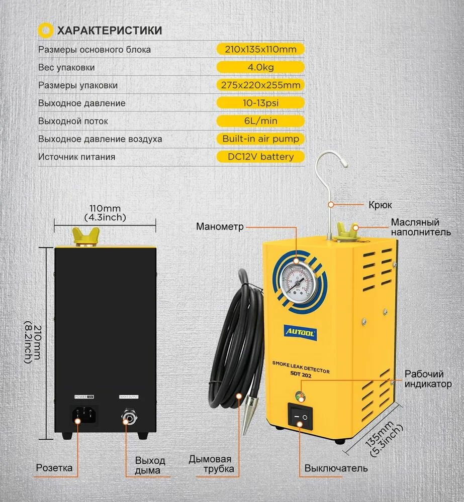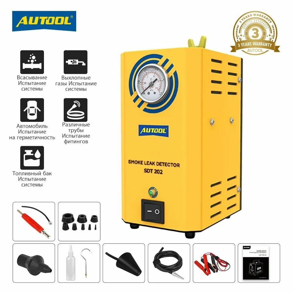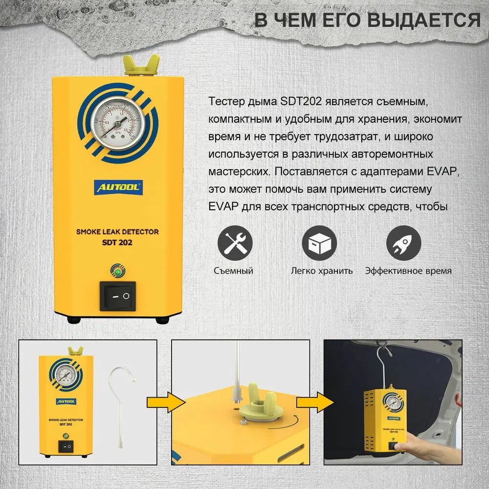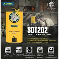 AUTOOL SDT202 Автомобильный детектор дыма в системе EVAPАвтомобильный детектор утечек дыма AUTOOL SDT 202 - это профессиональный детектор дыма в автомобильных каналах. Проводимые испытания включают в себя испытания системы воздухозабора, испытания выхлопной системы, испытания на герметичность автомобиля, испытания системы топливного бака и различные испытания трубок. Он помогает быстро и точно определить место утечки в трубопроводных системах автомобилей.
