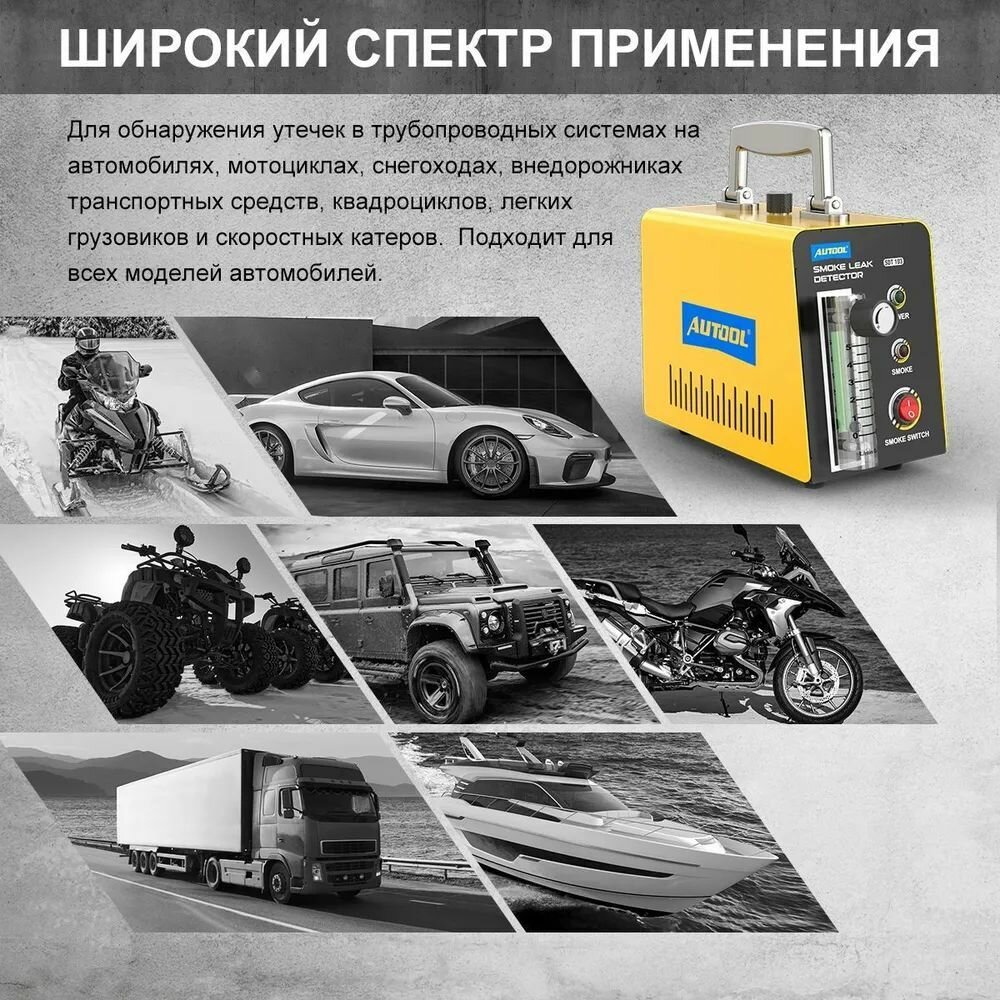 Дымогенератор AUTOOL SDT103 - это профессиональное оборудование для автосервисов, которое позволяет проводить комплексную диагностику различных систем автомобиля.