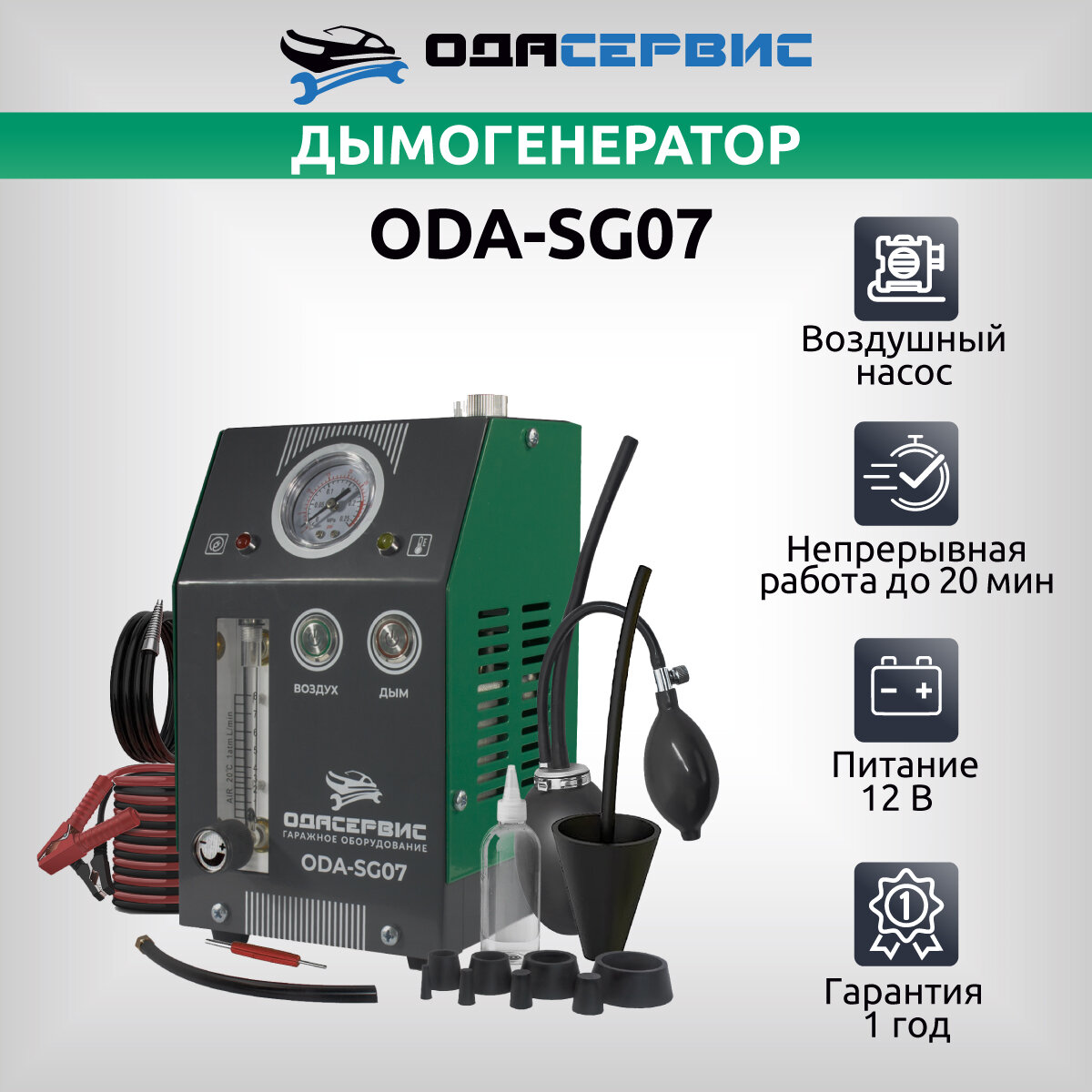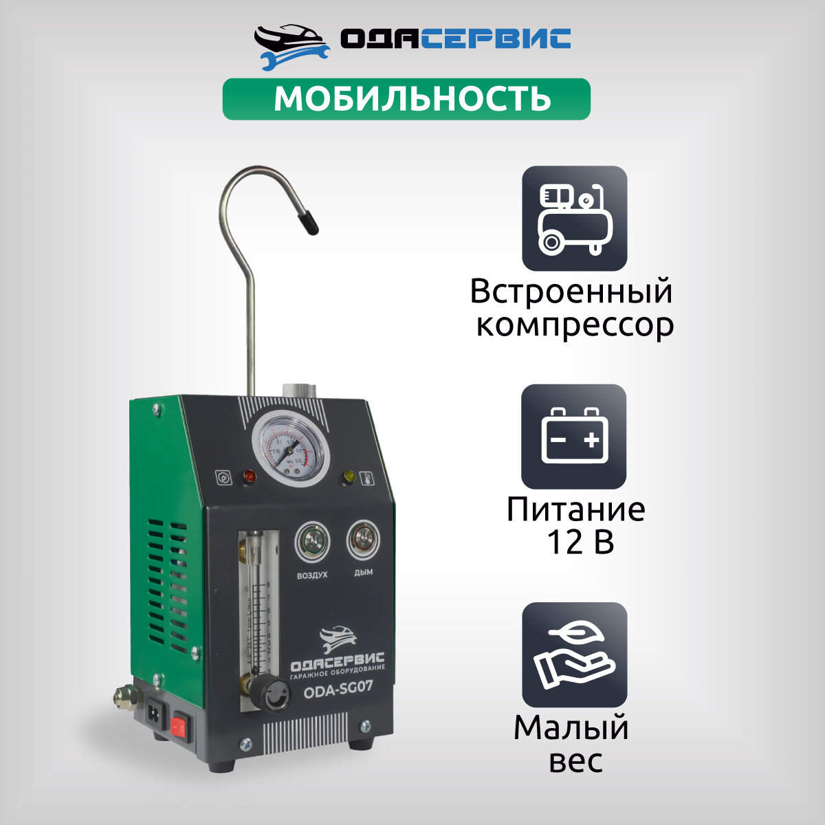 Дымогенератор ODA-SG07 со встроенным компрессором представляет собой легкий, компактный не требующий питания 220В прибор, имеющий два режима работы «Воздух» и «Дым» для оперативной диагностики автомобиля и эффективного обнаружения проблемы утечек «подсосов» воздуха в различных системах, требующих герметичность.