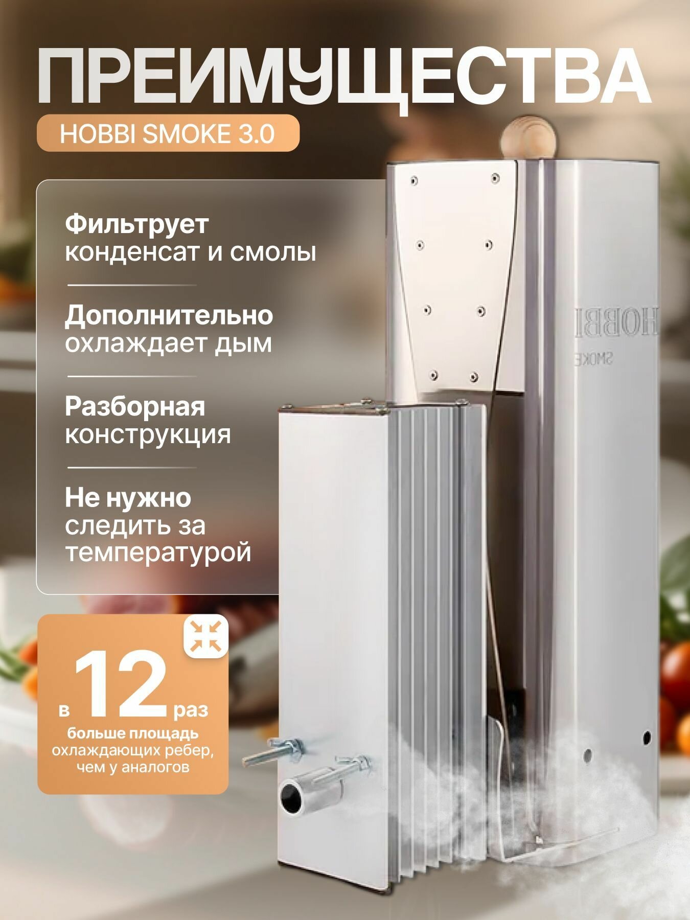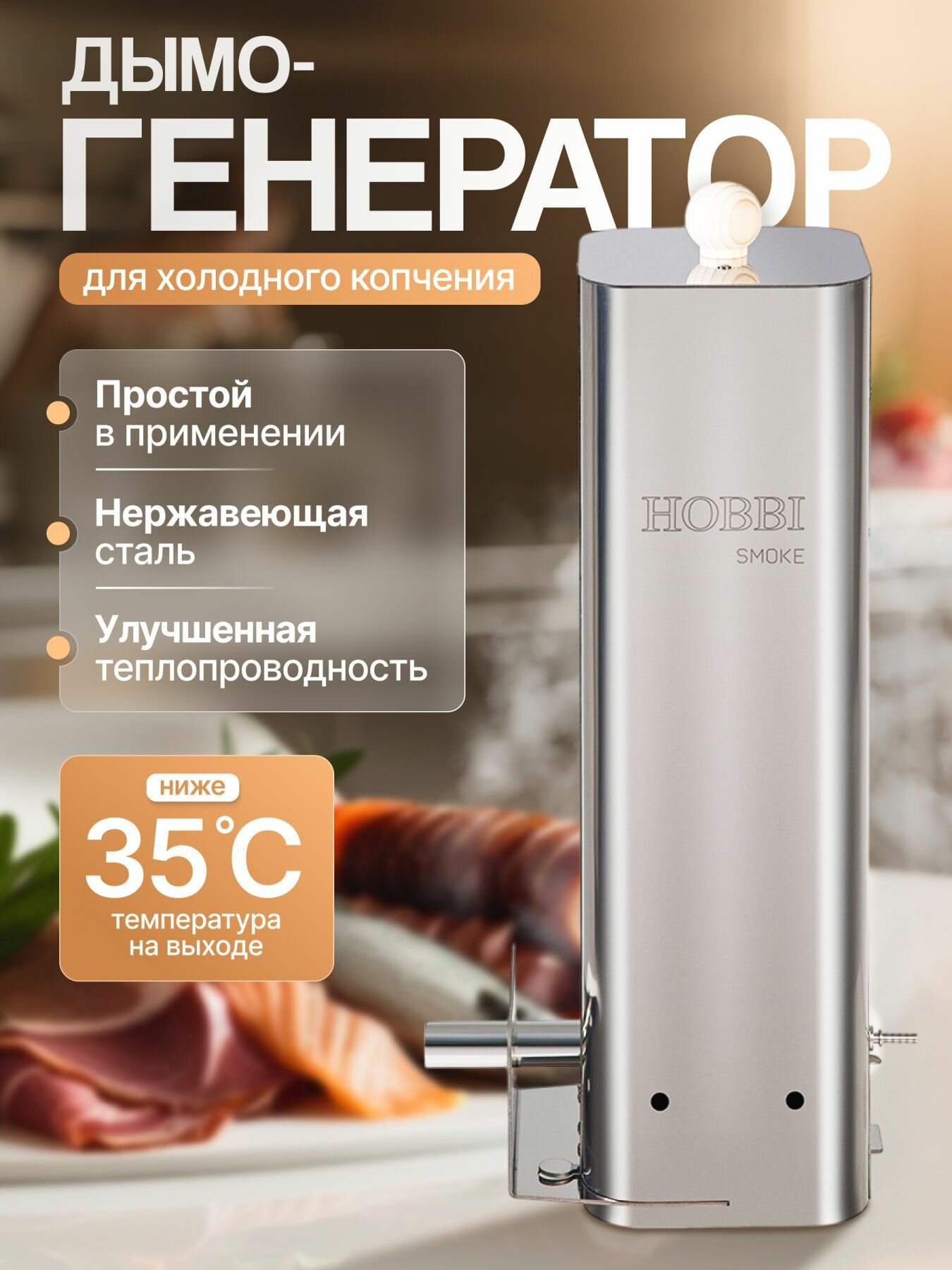 Дымогенератор Hobbi Smoke 3.0 от первого в России производителя дымогенераторов холодного копчения выполнен из нержавеющей стали AISI 430/304 толщиной 0,8 - 2мм и имеет невероятный запас прочности. Не зря мы даем гарантию на дымогенератор Hobbi Smoke целых 10 ЛЕТ! Благодаря продуманному дизайну и металлической конструкции из нержавейки, он прост в использовании и обслуживании, легко разбирается и чистится. Это самая компактная коптильня в серии (ш\*г\*в): 120\*230\*280 мм. В комплект входят колба генератора дыма, компрессор, влагоотделитель - охладитель, силиконовая трубка, крепежные болты, книга с рецептами для приготовления копченых блюд. С помощью этой техники вы сможете легко коптить мясные, рыбные и овощные продукты.