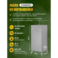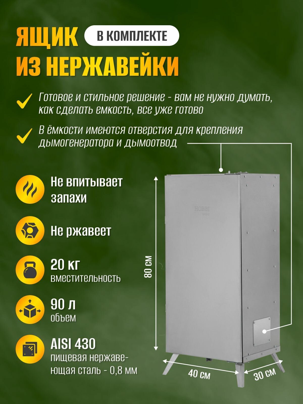 Стальной ящик – продуманная конструкция, где уже есть отверстия для дымогенератора Hobbi Smoke для отвода дыма. Изготовлен из пищевой нержавеющей стали AISI 430 толщиной 1.5мм, вмещает до 20 кг продукта и объем 90 л. Размеры емкости (ш\г\в): 40\30\80 мм.