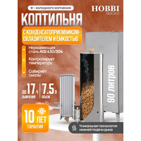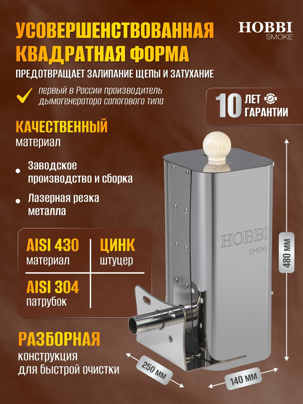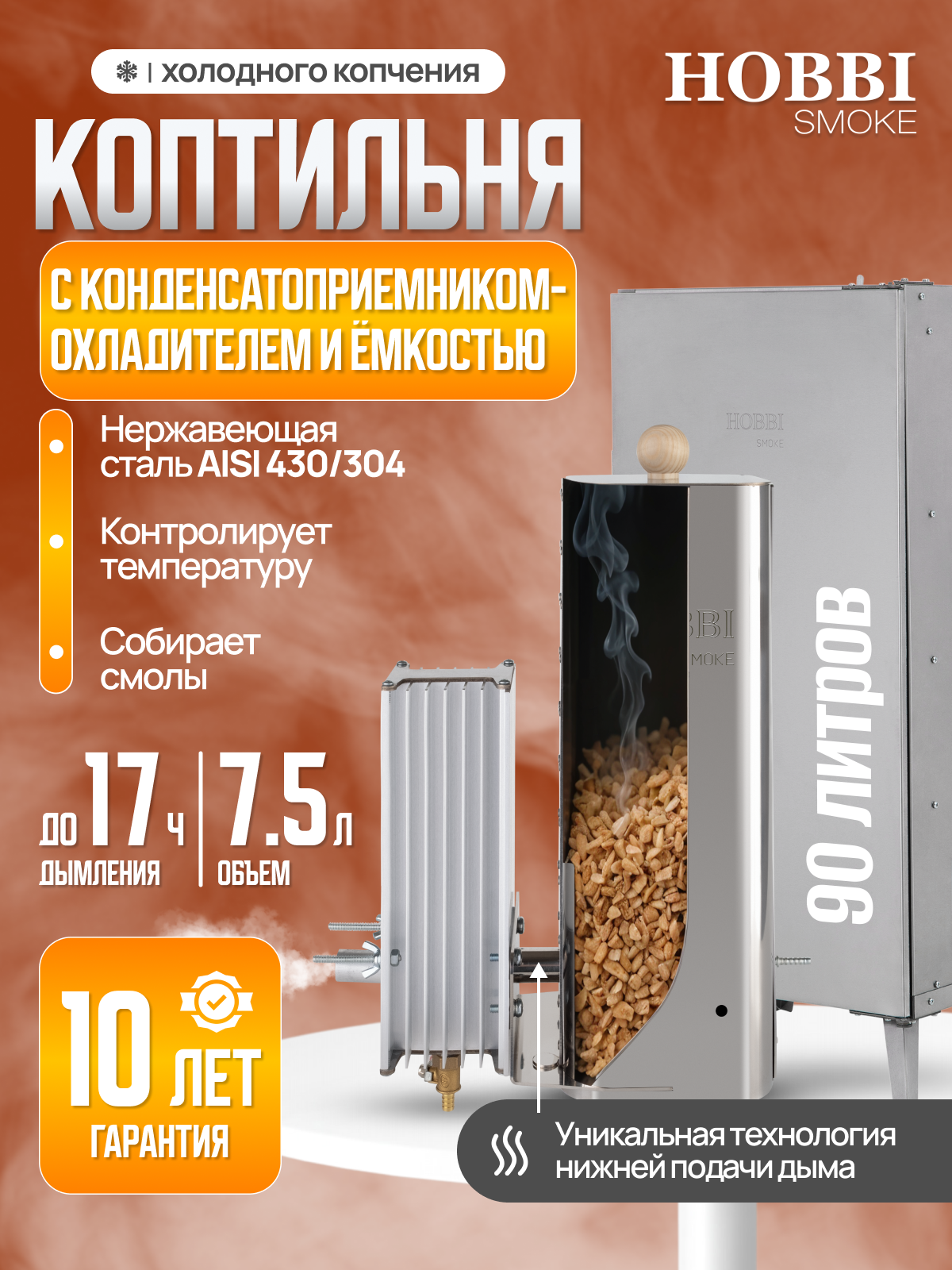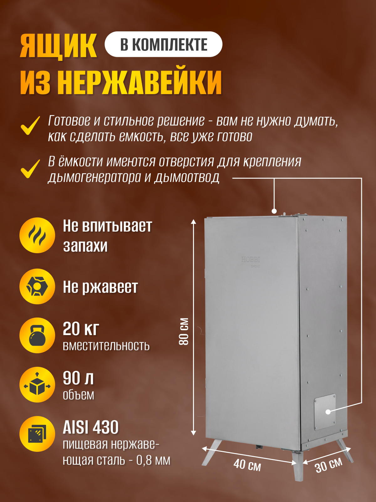 Дымогенератор - это специальное устройство, которое создано для того, чтобы коптить рыбу, мясо, овощи, фрукты, сало и другие продукты чистым и экологичным способом. Дымогенератор Hobbi Smoke от первого в России производителя дымогенераторов холодного копчения. Благодаря нашему огромному опыту - наши изделия лишены "детских болячек" и постоянно совершенствуются. В комплект входит колба дымогенератора, компрессор, конденсатоприемник, стальная емкость с решетками, крючками и поддоном для жира, силиконовая трубка, крепежные болты и в подарок кладем зажигалку, щепу на одну загрузку (она, как правило, лежит внутри колбы дымогенератора) и нашу фирменную книгу с рецептами. Легко разбирается и чистится. Готовьте только из качественных продуктов без химикатов и усилителей вкуса! Ведь с Hobbi smoke - это проще простого! Просто повесьте продукты в шкаф, загрузите сухую щепу в дымогенератор (важно! Влажность щепы не более 10-14%, фракция 3-7мм), подожгите щепу в емкости, включите компрессор и подождите. Вуаля! Лучшие деликатесы собственного производства готовы. Изделие выполнено из нержавеющей стали AISI 430/304 толщиной 0,8 - 2мм. Конструкция имеет невероятный запас прочности, и не зря мы даем гарантию на дымогенератор Hobbi Smoke целых 10 ЛЕТ! Все дымогенераторы Hobbi Smoke комплектуются конденсатоприемником. Это наша инновационная разработка в уникальной конфигурации. Он на деле сокращает на 70% попадание вредных веществ на продукт и помогает дыму быть холодным даже в самую жаркую погоду. Собирает в себя смолы и конденсат, не требует доработок в коптильне в виде баночек и других креплений. Дымогенератор Hobbi Smoke коптит, пока вы занимаетесь своими делами. Вам НЕ надо следить за температурой - ее контролирует охладитель.