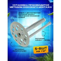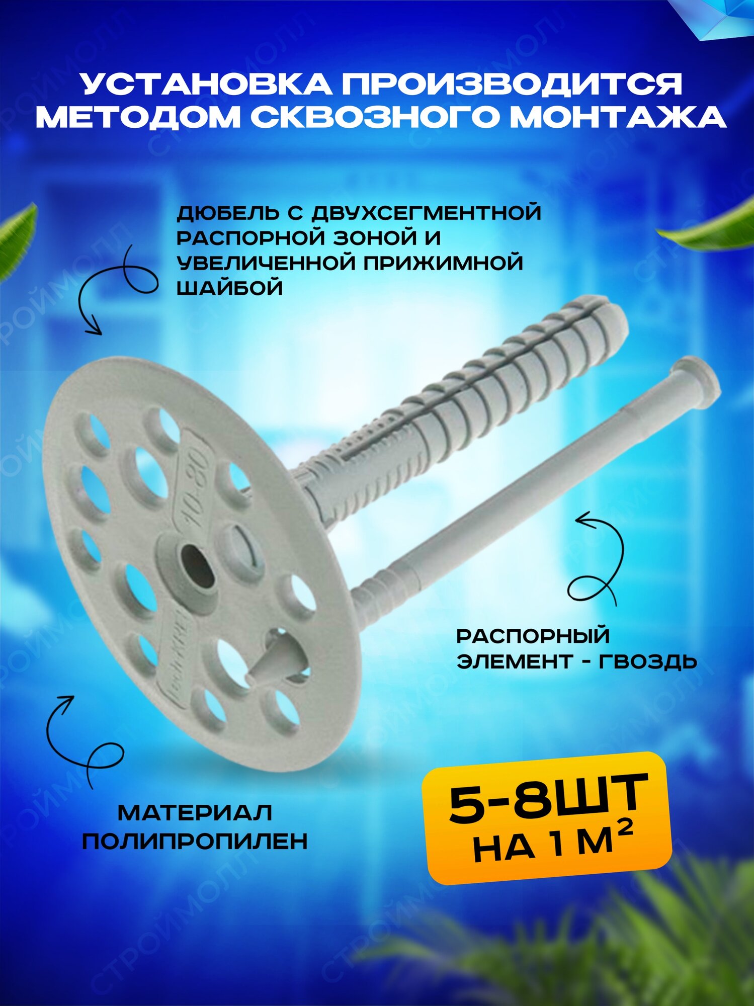 Преимущества применения крепежа очевидны: -высокая скорость монтажа теплоизоляционных материалов -надежное крепление за счет расклинивания дюбеля в жестком основании -устойчивость получаемого соединения к температурным -влажностным колебания -морозам, вибрации и деформационным процессам (например, возникающих во время усадки строения)