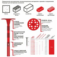 Дюбель изготовлен из полипропилена, что гарантирует его долговечность и устойчивость к воздействию атмосферных условий. Металлический гвоздь обеспечивает надежное крепление дюбеля к поверхности, что позволяет использовать его для монтажа на стенах, подверженных неблагоприятным воздействиям.