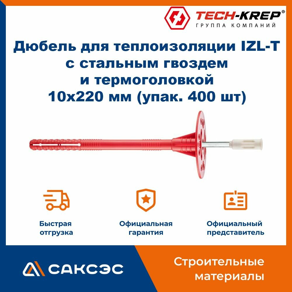 Купить Дюбель для теплоизоляции IZL-T со стальным гвоздем и термоголовкой 10х220 мм (упак. 400 шт), Tech-Krep с доставкой по всей России. Дюбель для теплоизоляции IZL-T со стальным гвоздем и термоголовкой 10х220 мм (упак. 400 шт), Tech-Krep: сравнение цен, характеристики, фото, актуальное наличие и цены.