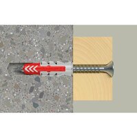 Базовый компонент серого цвета выполнен из высококачественного нейлона. Он оснащен стопорными зубцами, благодаря которым исключается прокручивание дюбеля в отверстии. Красный компонент выполняет две функции: укрепление первой детали и создание дополнительного распора внутри отверстия . В зависимости от конфигурации, длина дюбеля DUOPOWER может составлять от 25 до 70 мм. Минимальная толщина основания составляет 12,5 мм. Диаметр варьируется от 5 до 14 мм.