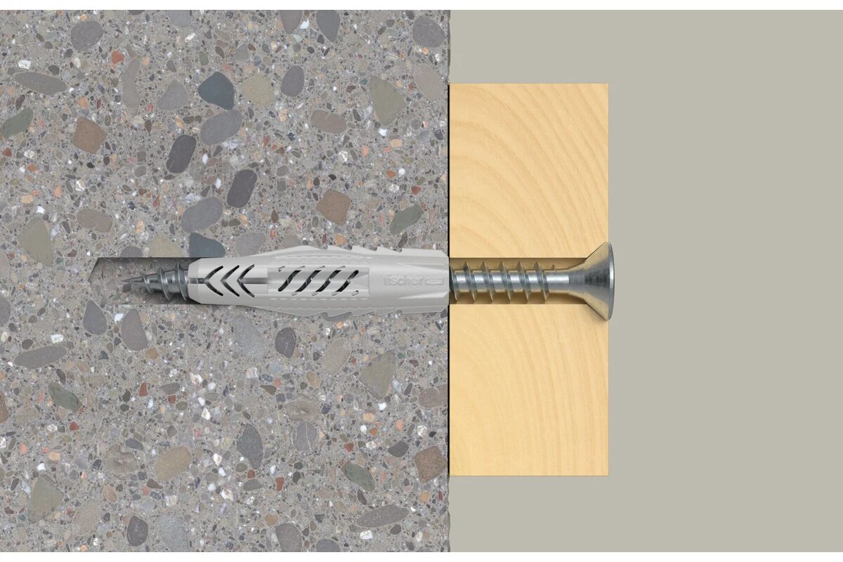 информация ПО установке: Уникальная форма дюбеля позволяет использовать его практически во всех строительных материалах. Новый зубчатый стопорный элемент предотвращает прокручивание дюбеля в просверленном отверстии. Низкий уровень сопротивления закручиванию и высокий момент затяжки обеспечивают высокопрофессиональный и безопасный монтаж. Может использоваться с шурупами по дереву и шурупами для ДСП с размерами от 4 до 12 мм. Встроенный стопорный элемент предотвращает преждевременный распор, например, при сквозном монтаже. Кромка дюбеля UX-R не позволяет ему заглубиться в отверстие на большую глубину.