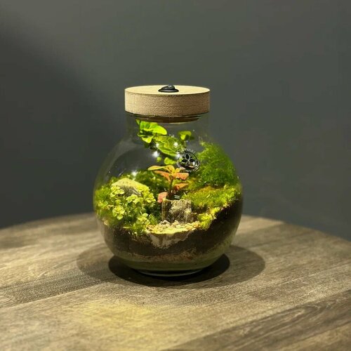 Это прекрасный компактный флорариум с очень интересным рельефом, зелёным мхом и, при этом достаточно бюджетный. Его безумно приятно держать в руках и рассматривать. Он идеально впишется в любой интерьер, он мобильный и его удобно поставить практически где удобно. Его композиция будет радовать вас при каждом взгляде, и напоминать о том, что в вашей стеклянной колбе живёт настоящий маленький мир