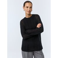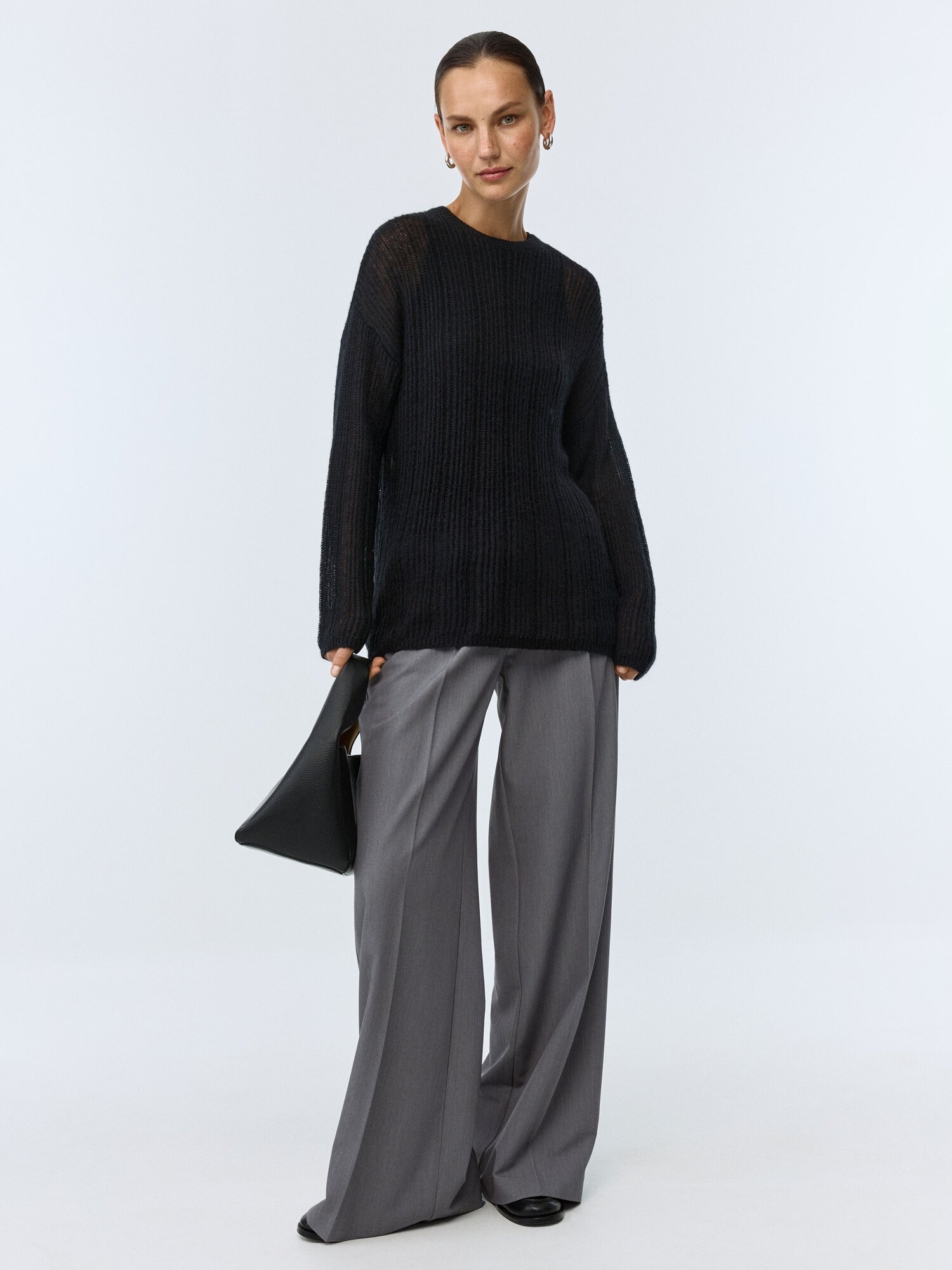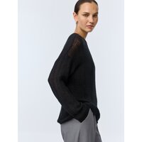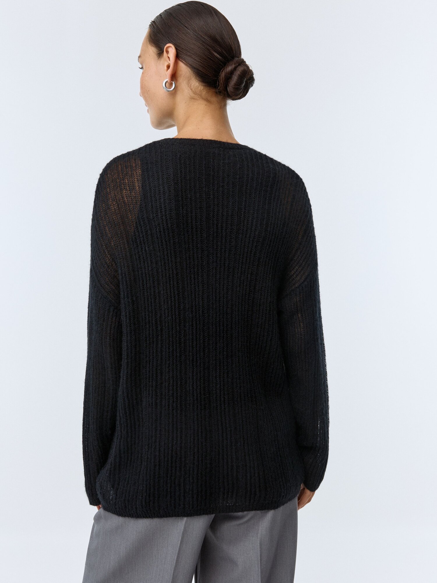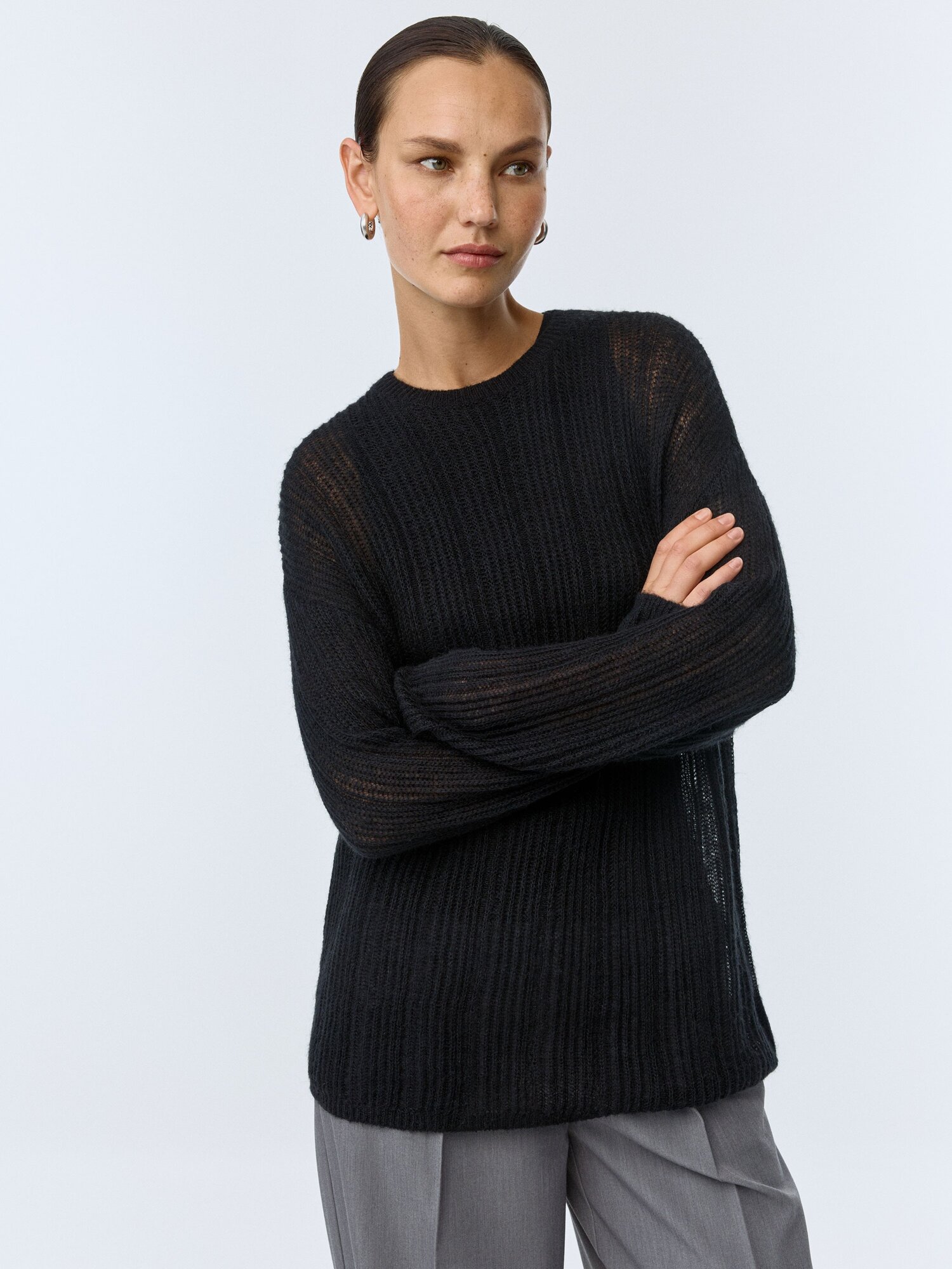 Легкий полупрозрачный джемпер свободного кроя со спущенной линией плеча, круглым вырезом горловины и длинным рукавом из мягкой смесовой пряжи с добавлением шерсти и мохера