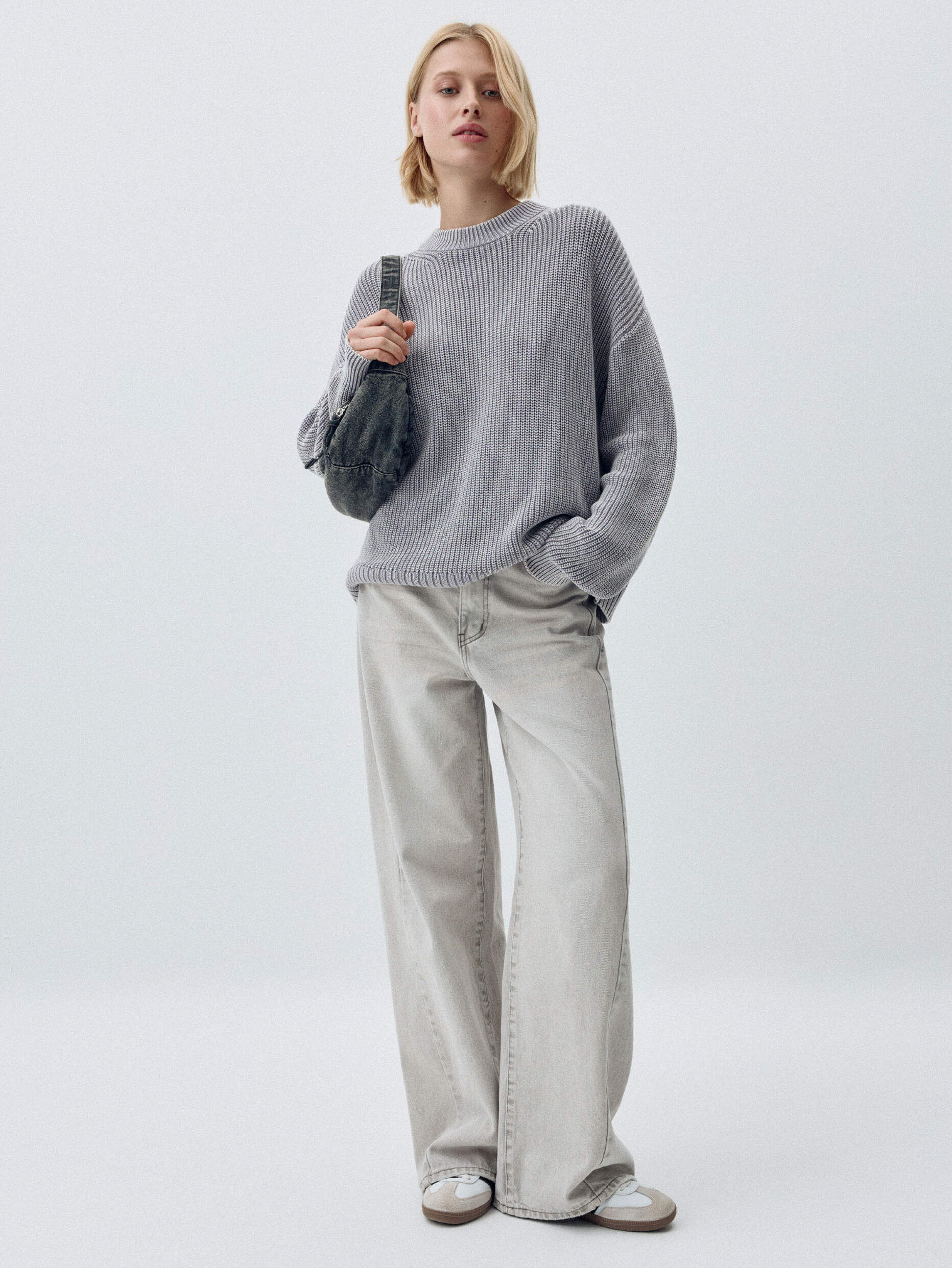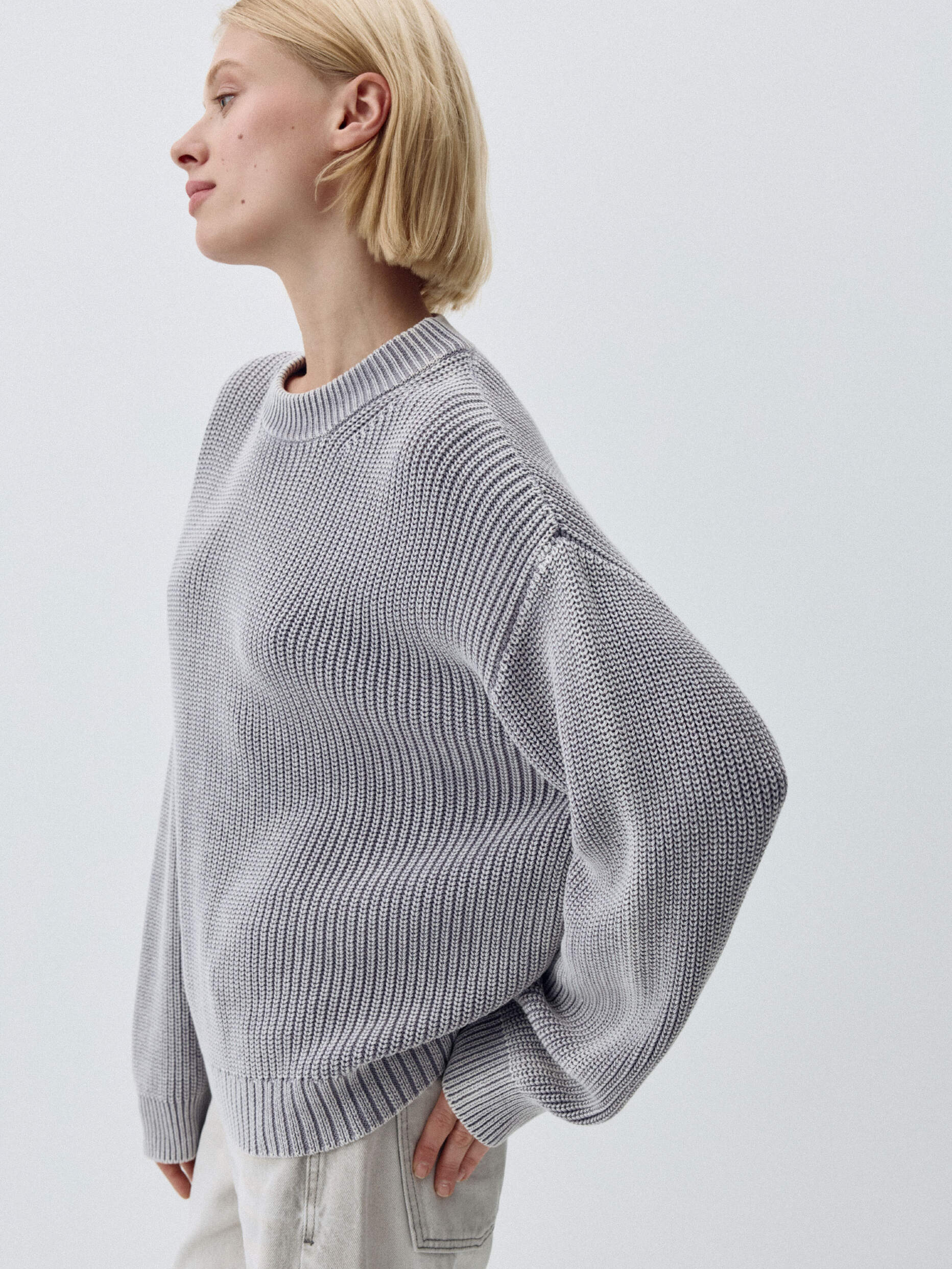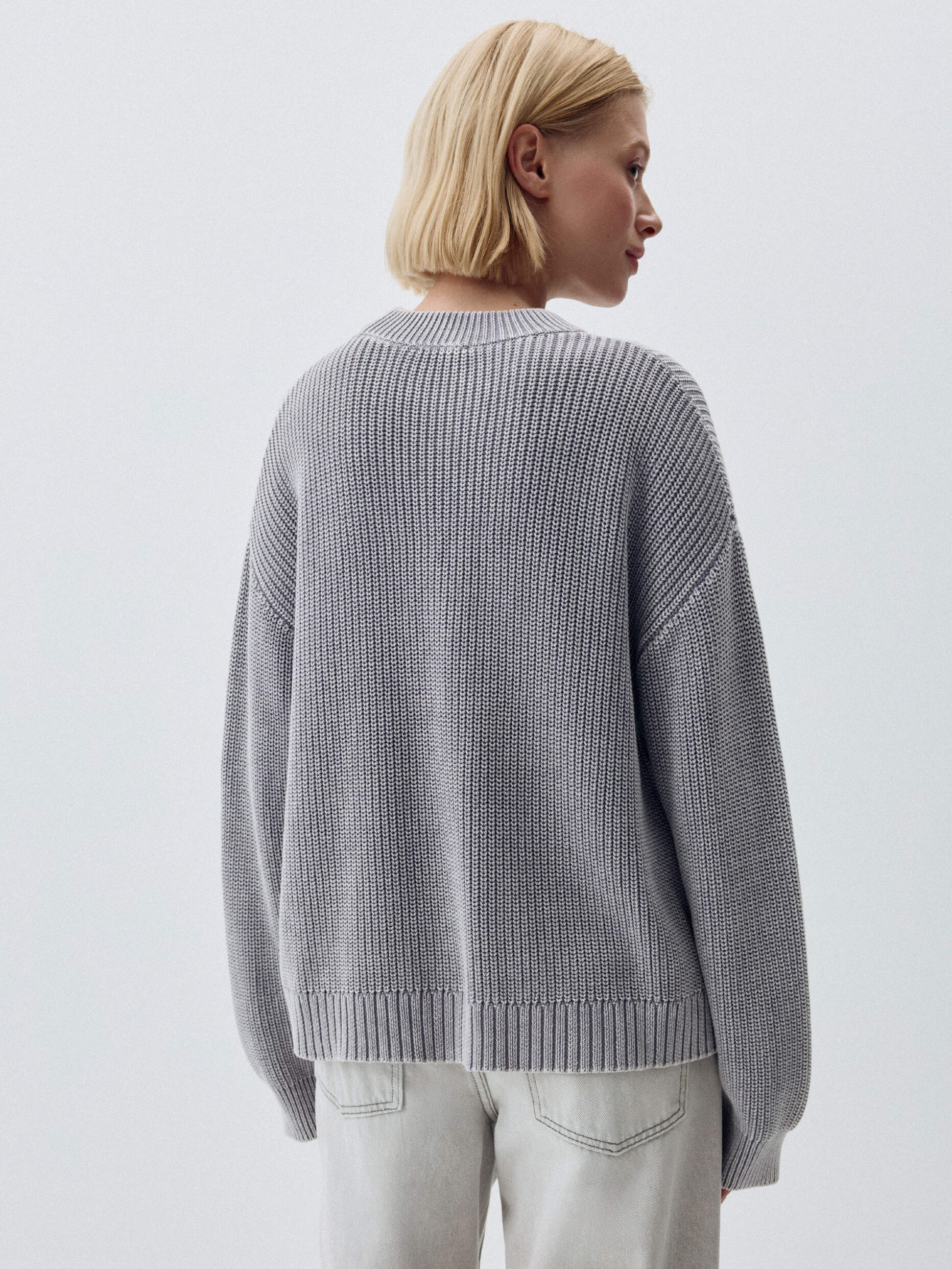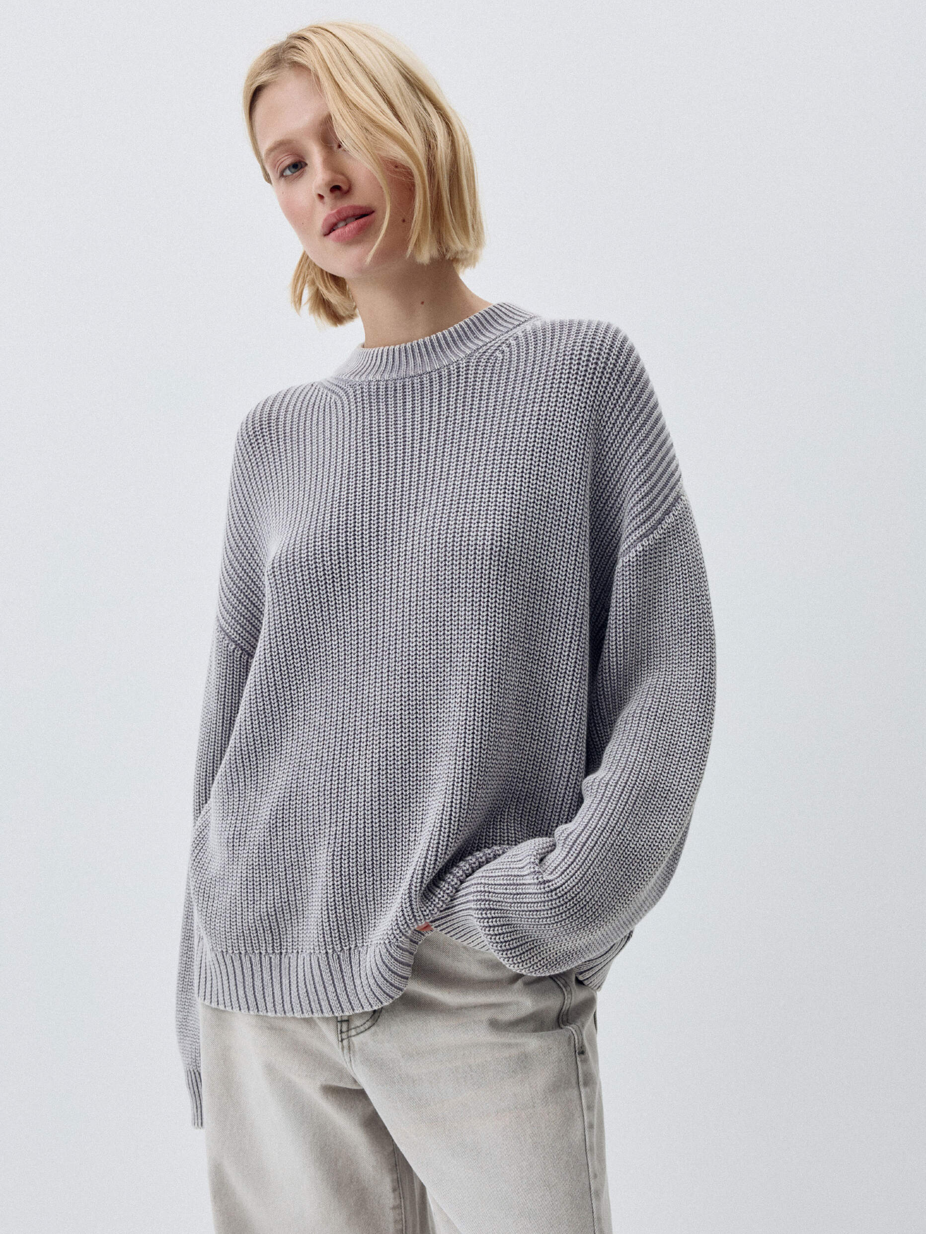 Вязаный джемпер с эффектом кислотной стирки. Мягкий хлопковый трикотаж. Свободный прямой крой со спущенной линией плеча. Круглый вырез горловины и длинные рукава. Манжеты и подол в рубчик. На модели представлен размер S. Параметры модели: 175/80/60/89.