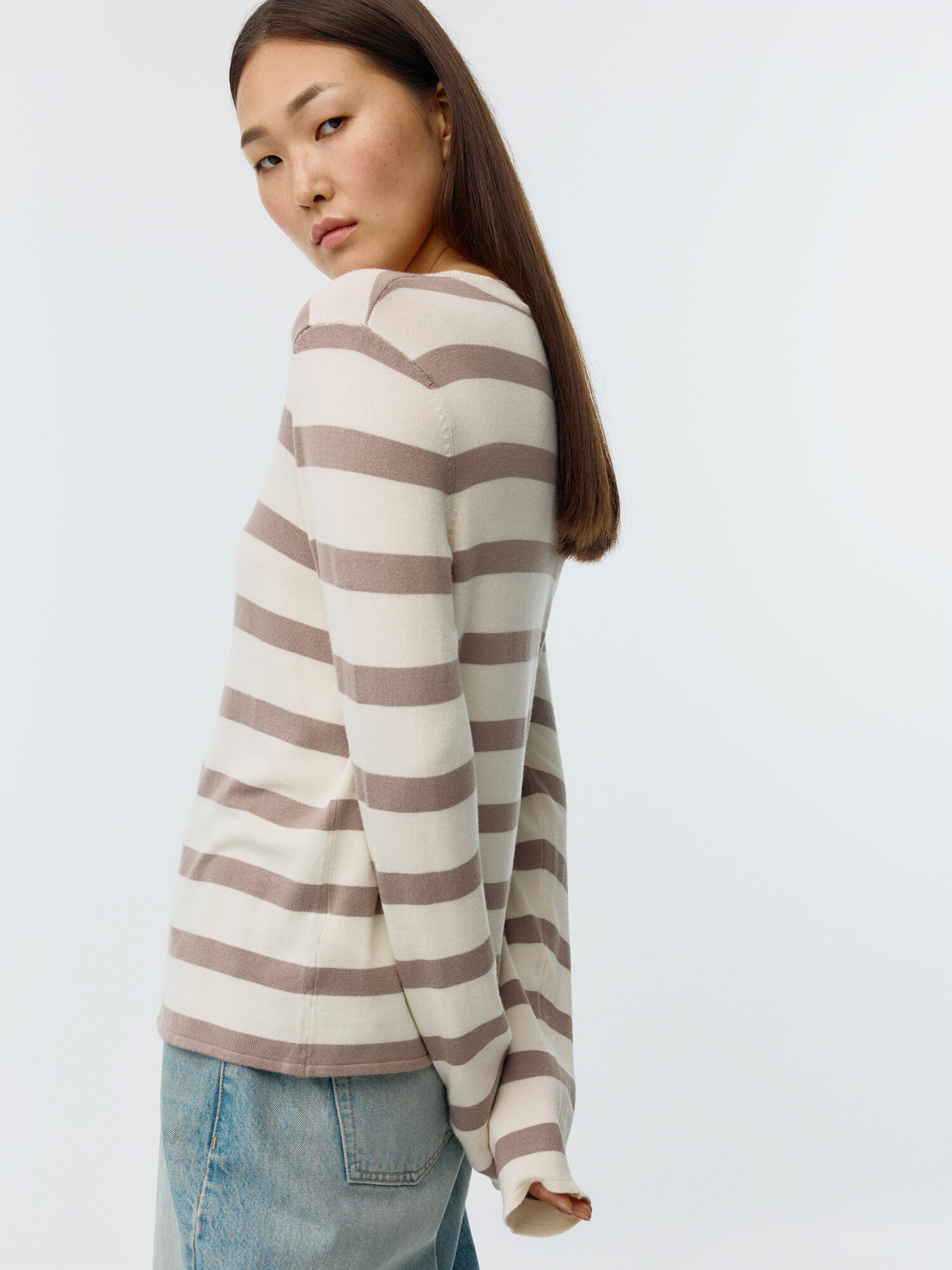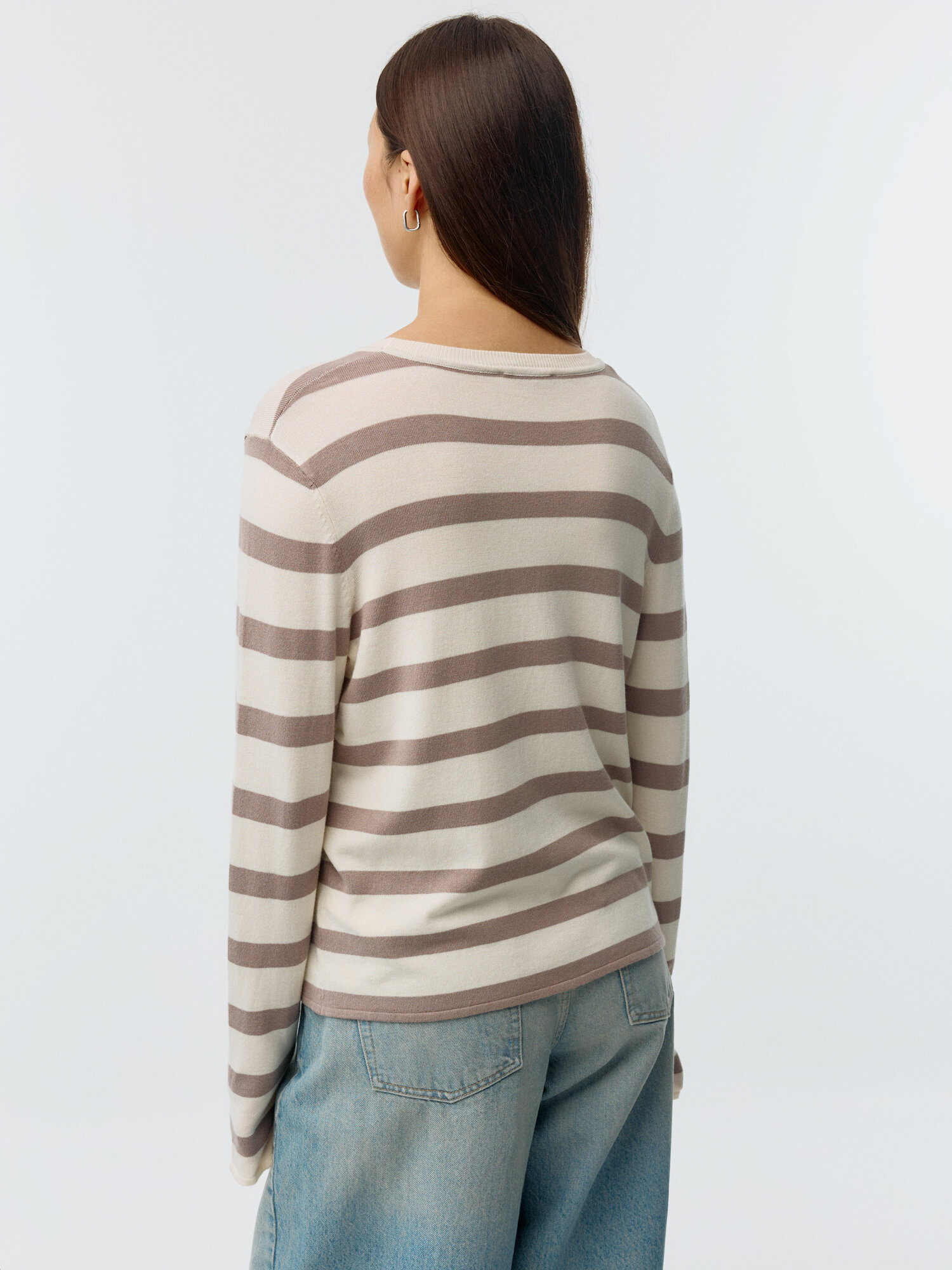 Джемпер выполнен в нейтральных цветах, что позволяет легко комбинировать его с различными элементами гардероба. Полоска добавляет изюминку и делает образ более интересным.