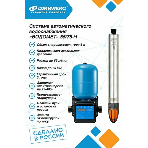 Система автоматического водоснабжения «водомет» 55/75-Ч с частотным регулированием предназначена для бесперебойного водоснабжения в автоматическом режиме коттеджей, дач и ферм. Главное преимущество системы — поддержание постоянного заданного давления в водопроводной сети независимо от количества одновременно работающих точек водоразбора. В системе установлен насос, который обладает максимальным расходом 55 литров в минуту и максимальным напором 75 метров. Он способен перекачивать воду с содержанием песка во взвешенном состоянии до 2 килограмм на кубический метр воды. Электродвигатель насоса надежно защищен от перегрева потоком омывающей воды, что позволяет насосу работать не полностью погруженным в воду. Пульт управления насосом «водомет» 55/75-Ч, является микропроцессорным пультом управления, оснащенным цифровым дисплеями и клавиатурой, позволяющими программировать режим работы насоса и просматривать значения давления в водопроводной сети, потребляемого тока, коэффициента загрузки электродвигателя и информацию о возникающих ошибках. Он обеспечивает насосу комфортные условия работы, так как служит для: плавного пуска и плавной остановки насоса, поддержания заданного диапазона давления в водопроводной сети, защиты насоса от «сухого хода», перегрузок и скачков напряжения. Пульт управления в своем составе имеет гидроаккумулятор, который служит для аккумулирования воды под давлением и сглаживания колебаний напора в сети.