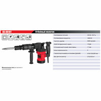 Основные характеристики: Напряжение - 220 В; Частота - 50 Гц; Мощность - 1800 Вт; Количество ударов - 3000 уд/мин; Максимальная энергия удара - 15 Дж; Установочный размер хвостовика - 17 мм; Длина сетевого кабеля - 2 м; Вес инструмента - 6,5 кг.
