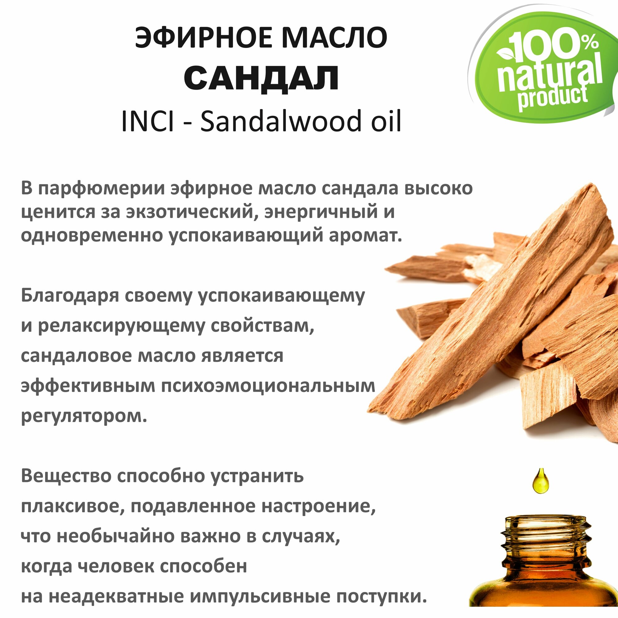 Благодаря своему успокаивающему и релаксирующему свойствам, сандаловое масло является эффективным психоэмоциональным регулятором. Вещество способно устранить плаксивое, подавленное настроение, что необычайно важно в случаях, когда человек способен на неадекватные импульсивные поступки.