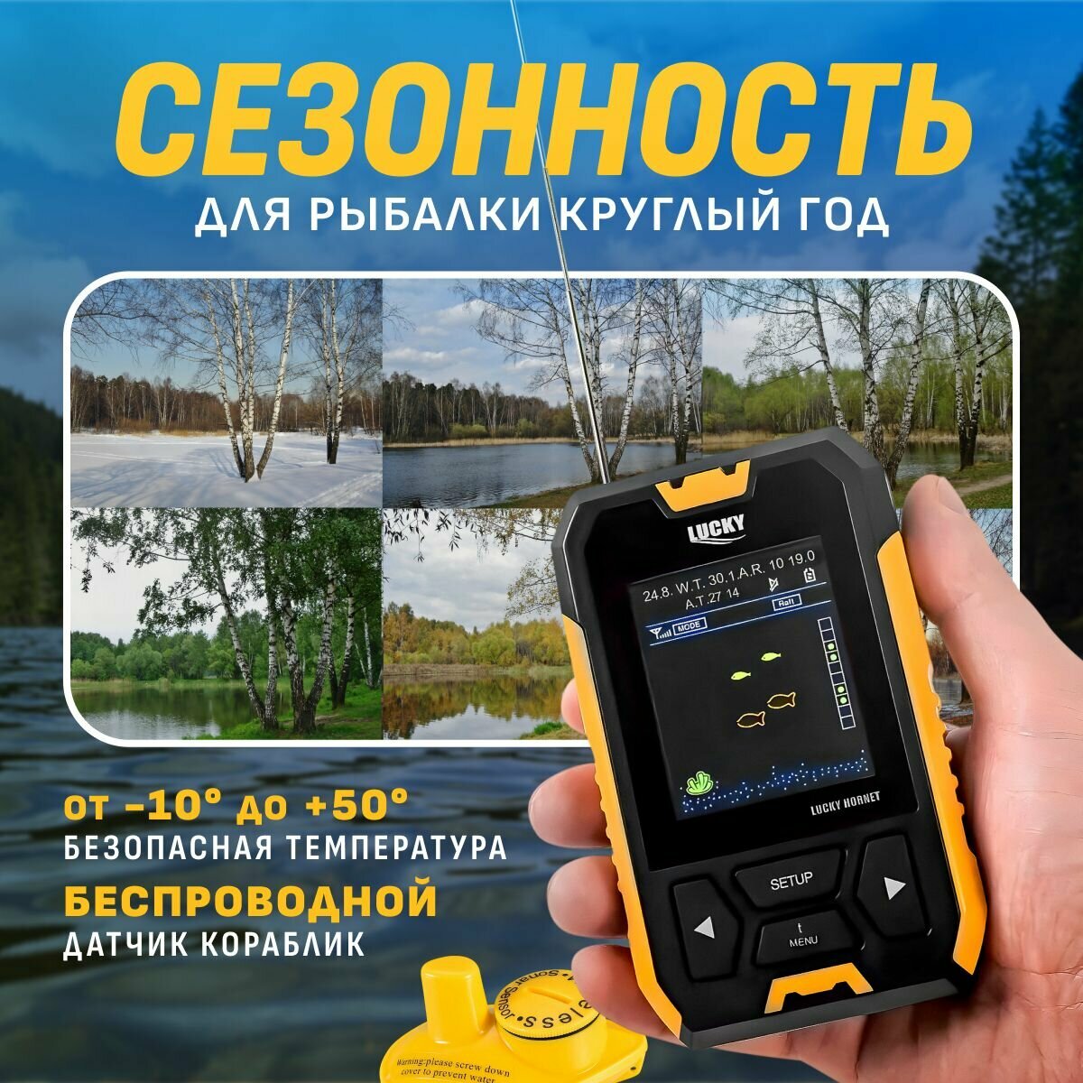 Эхолот Lucky Hornet FL218TPA-W в помощь рыболову покажет температуру воздуха и атмосферное давление.