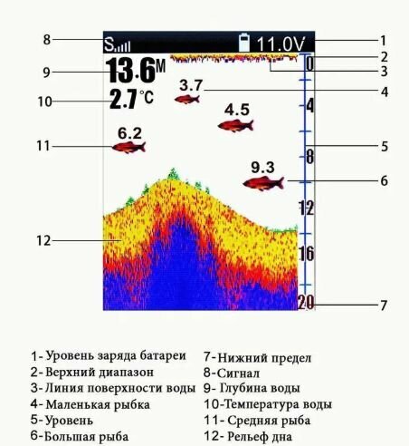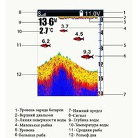 | Функции и интерфейсы | GPS, датчик скорости, датчик температуры, звуковая сигнализация, определение глубины рыбы, определение размера рыбы, отображение структуры дна |