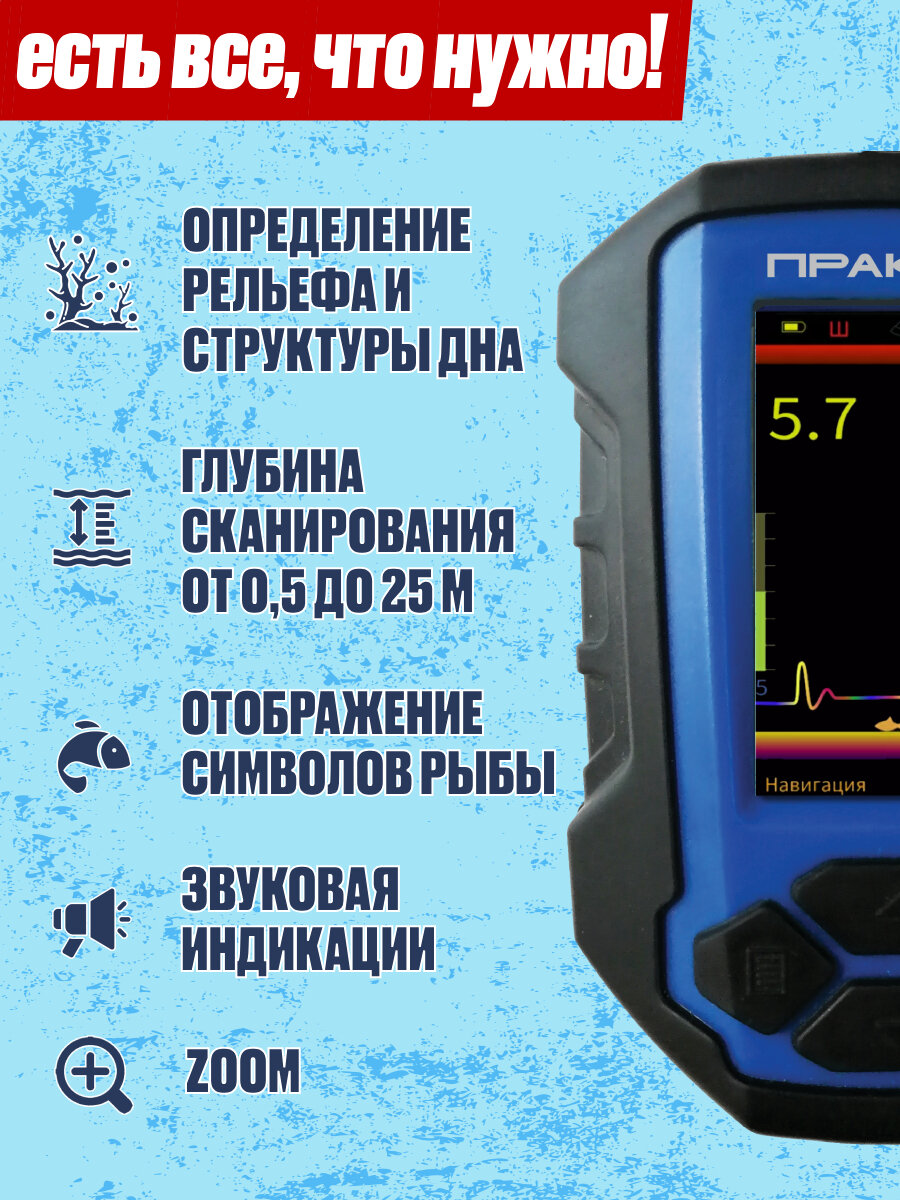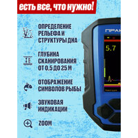 Практик 8 оснащен инновационной многочастотной системой зондирования, которая обеспечивает максимально точные результаты сканирования на глубинах от 0,5 до 70 метров (полноценный глубиномер). В нем реализована функция отображения символов рыбы, что позволяет легко определять ее местонахождение в воде. Практик 8 оснащен 2 независимыми лучами с углом раскрытия 12° и 35° и частотой сканирования от 300 до 500 кГц. Это позволяет получать точную информацию о рыбной активности в воде на разных глубинах и в различных условиях, а также более детально анализировать состояние и рельеф грунта на дне. Практик 8 имеет удобную и интуитивно понятную навигацию, что позволяет легко управлять всеми настройками, используя только четыре кнопки. Кроме того, уже запрограммированные "горячие" клавиши позволят получить доступ к наиболее важным функциям, не заходя в меню. Автоматический режим масштабирования экрана самостоятельно настраивает глубину, что крайне удобно для большинства рыбаков. Контролируйте игру Вашей блесны-приманки и следите, как рыба реагирует на нее, благодаря функции 5-кратного «Зума», а высокая разрешающая способность позволяет наблюдать даже сантиметровые колебания.