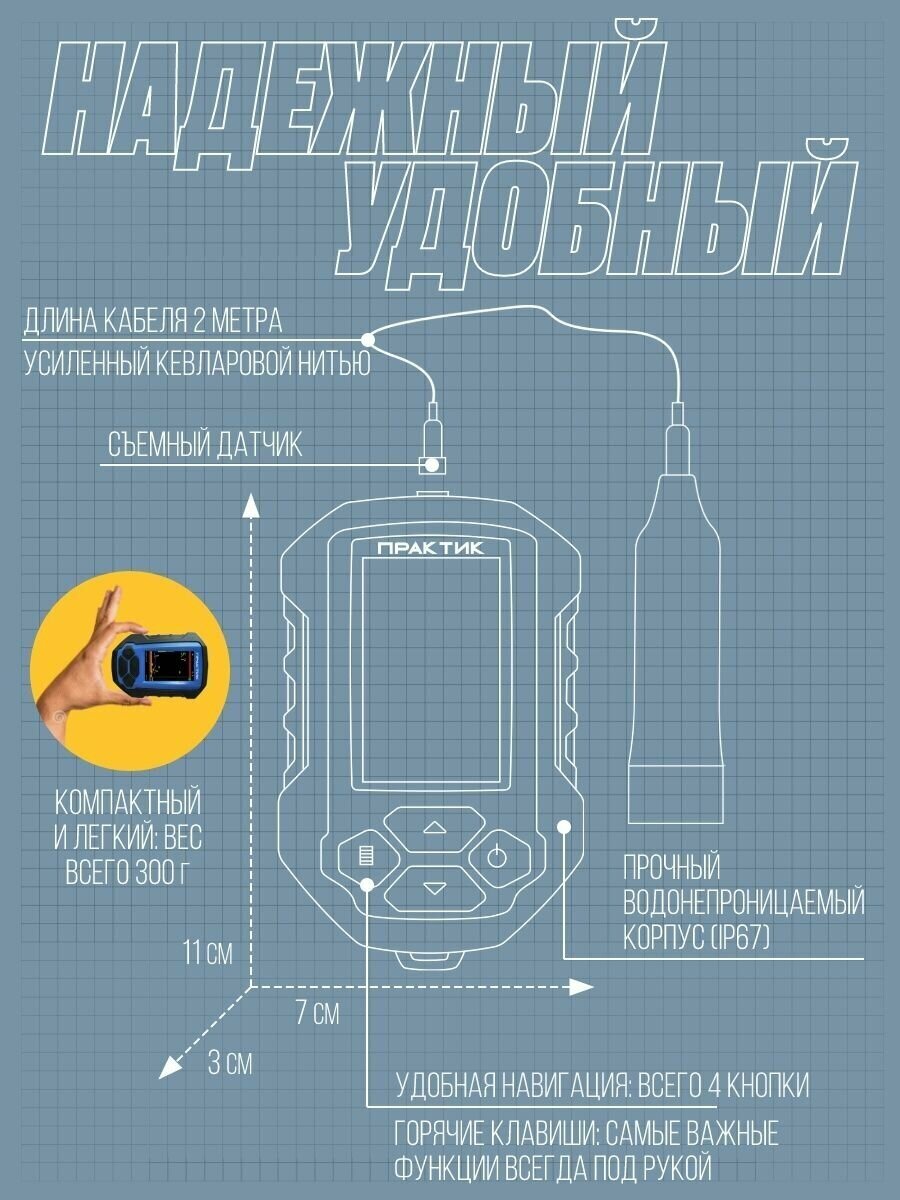 Компактность – это второе имя эхолота Практик 8. Габариты электронного блока составляют 107х70х28 мм, а вес – всего 300 граммов. Это позволяет легко и удобно транспортировать его с собой на рыбалку.
