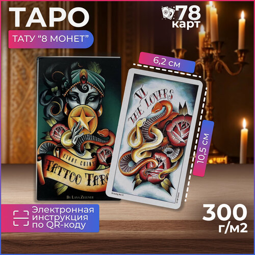 Эта ярко иллюстрированная колода отражает художественное развитие татуировщика и дизайнера Ланы Зеллнер. Колода из 82 карт включает в себя все ее оригинальные карты Таро, а также четыре новые карты, написанные специально для этого издания. На картах представлены художественные формы и знаковые образы как из традиций татуировки, так и таро, все они нарисованы от руки акварелью в стиле штриховка. В 188-страничной книге на английском языке представлены полноцветные увеличенные иллюстрации для каждой карты с восемью монетами, а также описания Ланы и уникальные идеи таро. В комплект входят: 82 карты (Размер карт7,6х12,7см), 188-страничная полноцветная книга на английском языке, Расклад Восемь монет Таро Роз, прочная картонная коробка.
