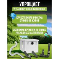 Набор: жироуловитель под мойку ЭкоЧист и комплект для установки жироуловителя. Наш комплект упростит установку и обслуживание. Все необходимые расходные материалы для установки жироуловителя собраны для Вашего удобства. С комплектом легко и просто установить жироуловитель. Качественная очистка стоков от жиров. Экономия времени на поиск расходных материалов. Жироуловитель компактный, простой в обслуживании. Подходит для: загородного, частного дома, кухни, кафе, столовой, гостиницы, ресторана. Емкость устанавливается под мойку. Для подключения не нужно обладать специальными знаниями. Из раковины в жироуловитель поступает вода с кусочками твердого жира и жидкой масляной взвесью. На дне общей камеры оседают плавающие в воде частички пищи, растворенный жир и остатки масла всплывают и создают на поверхности пленку. Очищенная от жиров сточная вода утекает в централизованную канализацию. Преимущества: отсутствие лишних перегородок, облегчает очистку своими силами. Уплотнитель на крышке - вспененный гернитовый шнур, обеспечивает отсутствие запахов и долговечность. Увеличенное количество качественных замков. Каждый образец тестируется на герметичность. В комплекте с жироуловителем прилагается технический паспорт.