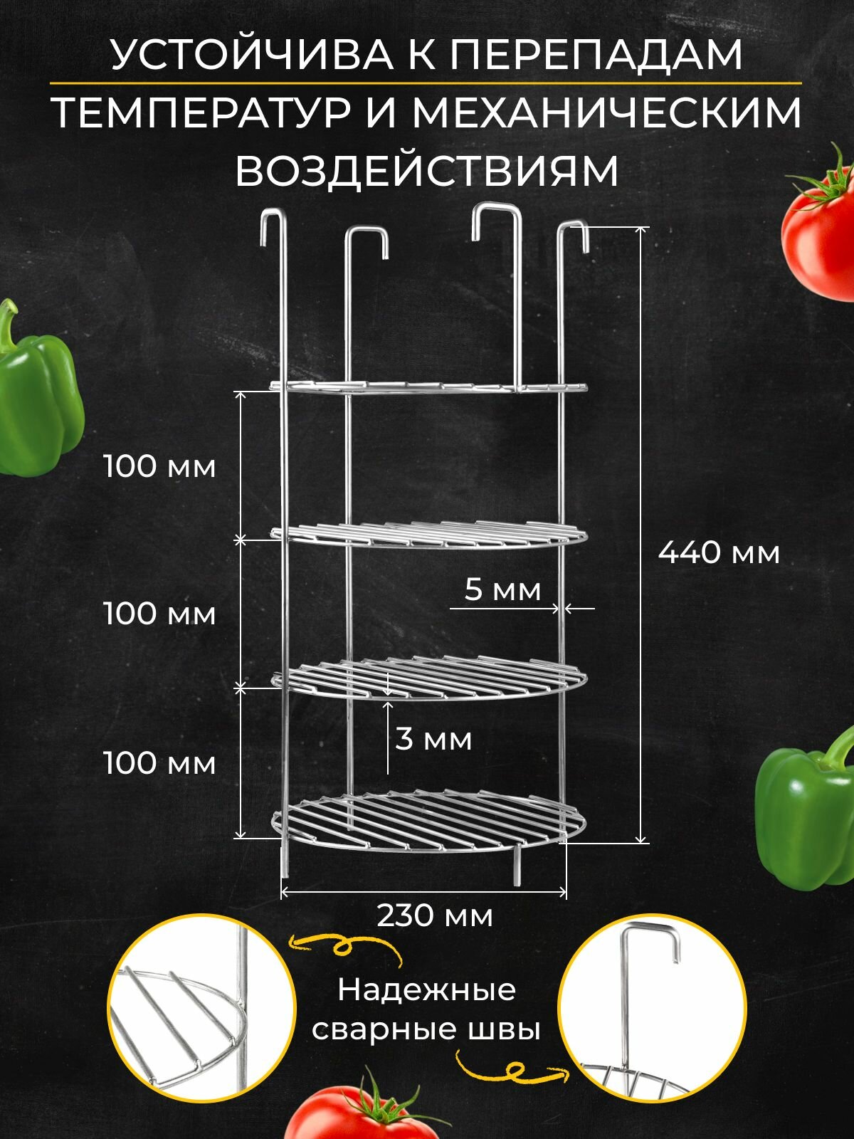 Выполнена этажерка из пищевой нержавеющей стали, усиленна и имеет повышенный запас прочности. Обратите внимание на то, что эта этажерка оборудована бортом, что не дает продуктам вкатываться за пределы этажерки. Используем TIG сварку — это усовершенствованный процесс, обеспечивающий превосходное качество поверхности.