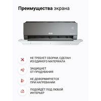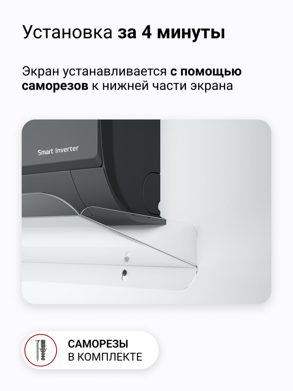 Для монтажа конструкции не требуется участие специалистов. Монтаж одного экрана занимает до 10 минут Легко снимается и ставится на место, не создавая проблем для сервисных служб Не препятствует работе пульта дистанционного управления и температурного датчика кондиционера