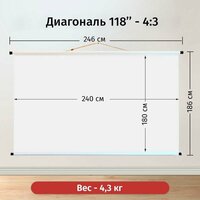 В комплектацию входит: 1 Экран 240x180, 1 железный трос для регулирования высоты экрана, 2 крепления ( один в стену, один в потолок), 1 липучка позволяет держать в собранном виде.