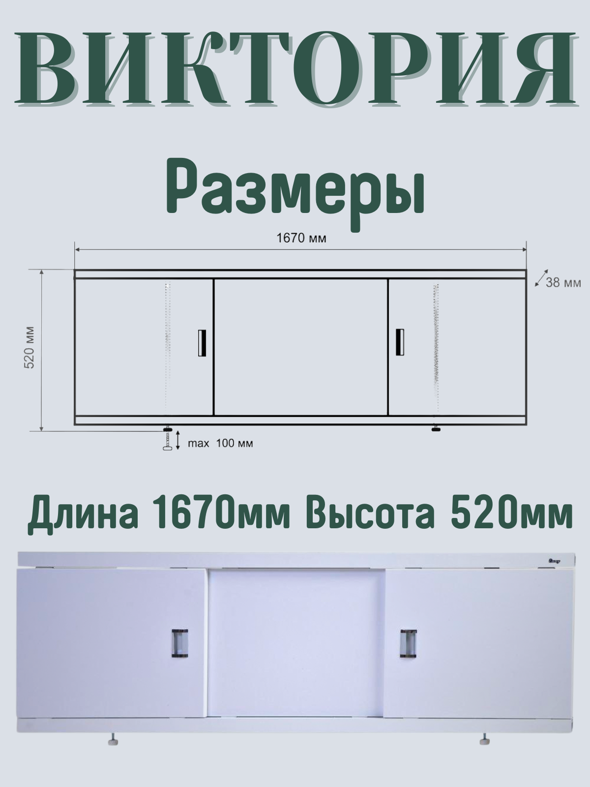 Экран-купе Виктория 170 изготовлен из МДФ, а профиль и стойки профиля надежно закреплены в алюминиевом профиле и окрашены порошковой краской белого цвета. Это позволяет изделию сохранять цвет и форму на долгий период эксплуатации в условиях повышенной влажности. Три фасада являются передвижными , это создает пространство под ванной для хранения, что позволяет получить доступ к сантехническим коммуникациям. Кроме того, торцы фасадов оформлены кромкой ПВХ, которая предотвращает их разбухание. Винтовые опорные ножки позволяют отрегулировать высоту экрана до нужного уровня. Монтаж экрана-купе под ванну с легкостью осуществляется самостоятельно. Вертикальные стойки смещены к центру, что позволяет при необходимости их подрезать. основа из алюминиевого каркаса, обработанная порошковым красителем; двери из МДФ