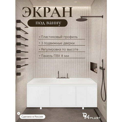 Каркас экрана выполнен из пластикового профиля. Экран раздвижной, имеет три створки. Фасад экрана: Панель ПВХ 8 мм; Высота полотна (без опоры) 485 мм; Минимальная высота экрана (с опорой) 520 мм; Установочная высота: 520-600 мм; Длина: 170 см; Фурнитура: - Регулируемая опора с подпятником 2 шт; - Ручка скоба 2 шт.