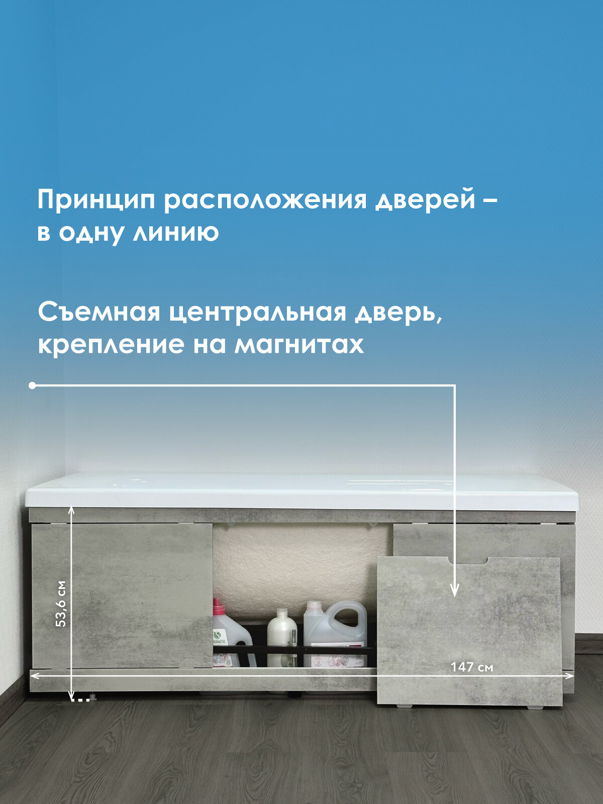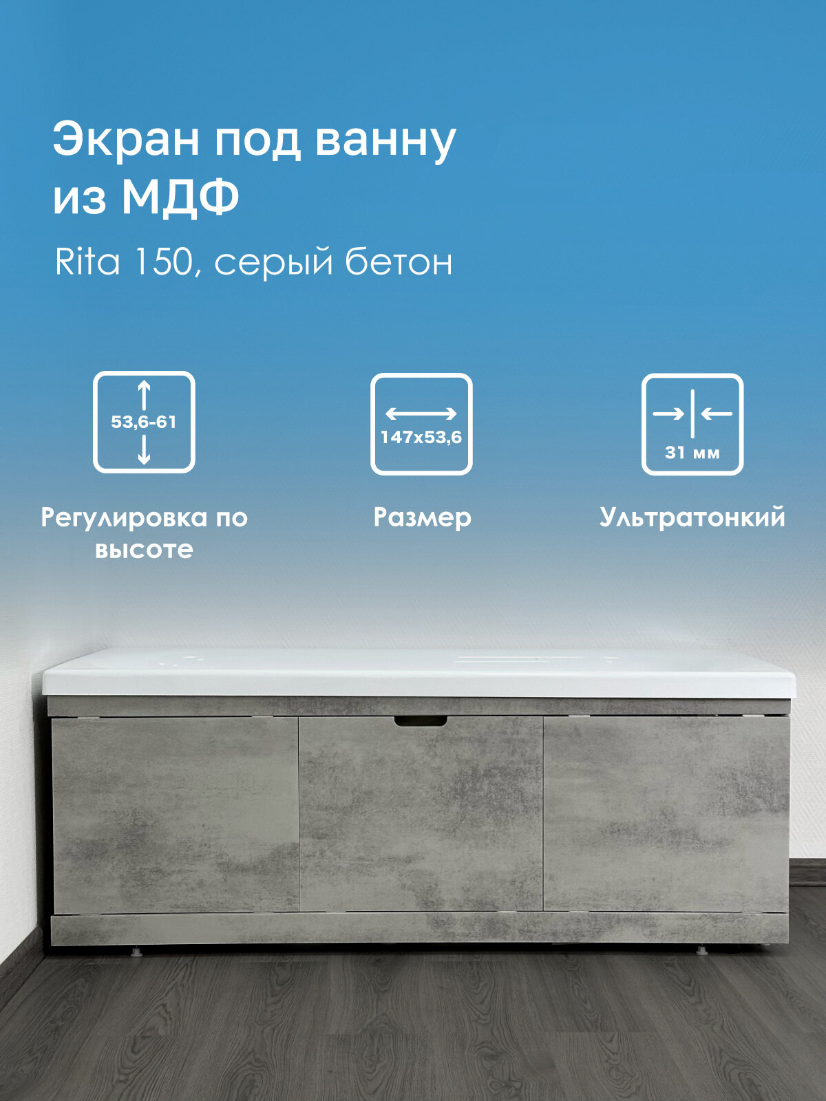 Экран под ванну из МДФ Rita 150 см серый бетон, раздвижной, центральная дверь на магнитах: сравнение цен, характеристики, фото, актуальное наличие и цены.