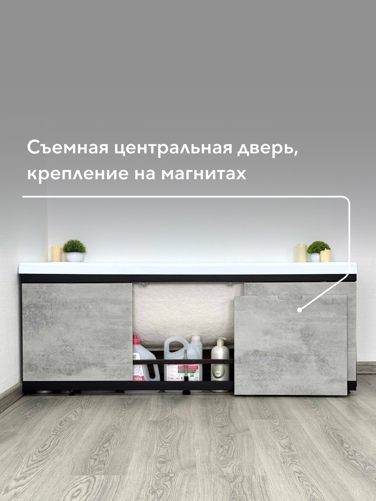 Купить Экран под ванну МДФ Rita Black 150 см серый бетон, раздвижной на алюминиевом профиле, центральная дверь на магнитах с доставкой по всей России.