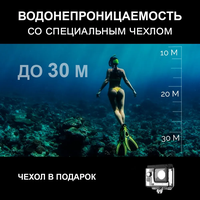 Шестиосевая гироскопическая стабилизация изображения; Максимальная глубина погружения 5 м (без аквабокса), 30 м (в аквабоксе); дистанционное управление со смартфона в приложении SJCAM Zone или браслета SJCAM remote control; Wi-Fi 2,4 ГГц / 5 ГГц
