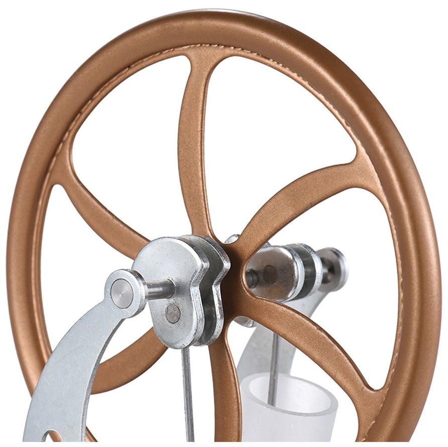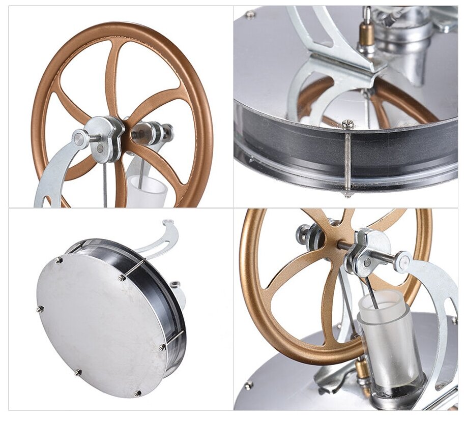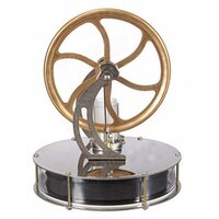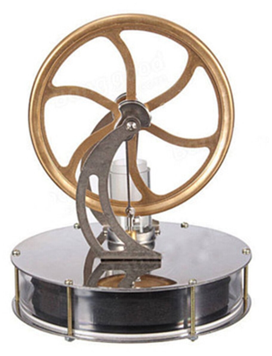 Настольная модель теплового двигателя Стирлинга. Экспериментальная модель, которая наглядно демонстрирует превращение тепловой энергии в механическую. Для запуска двигателя необходимо нагреть обычную воду, налить в сосуд и на сосуд сверху поставить двигатель. Подождите пару минут пока модель нагреется, после чего придайте вращение главному валу. Двигатель запустится и будет разгоняться по мере прогрева.