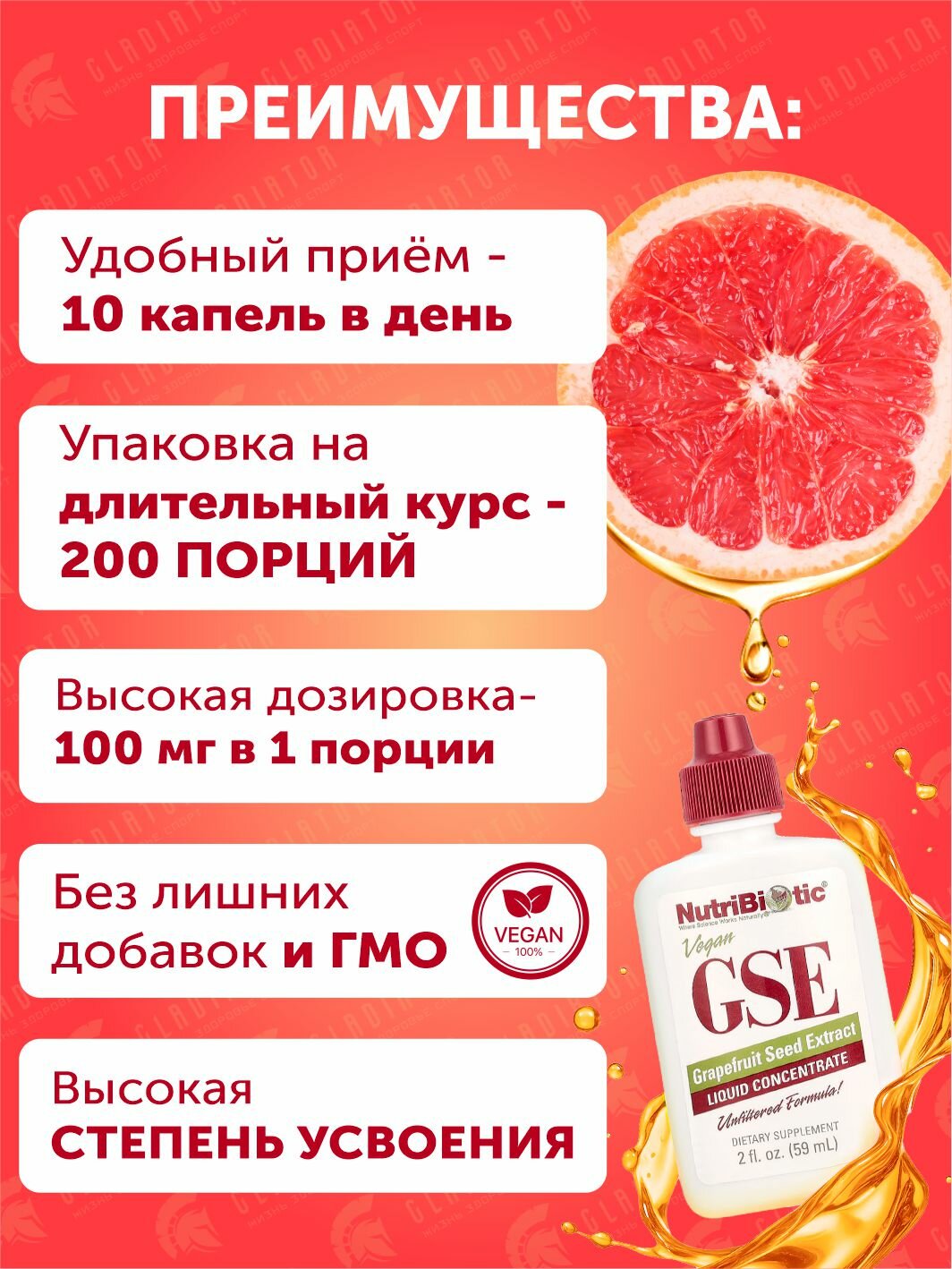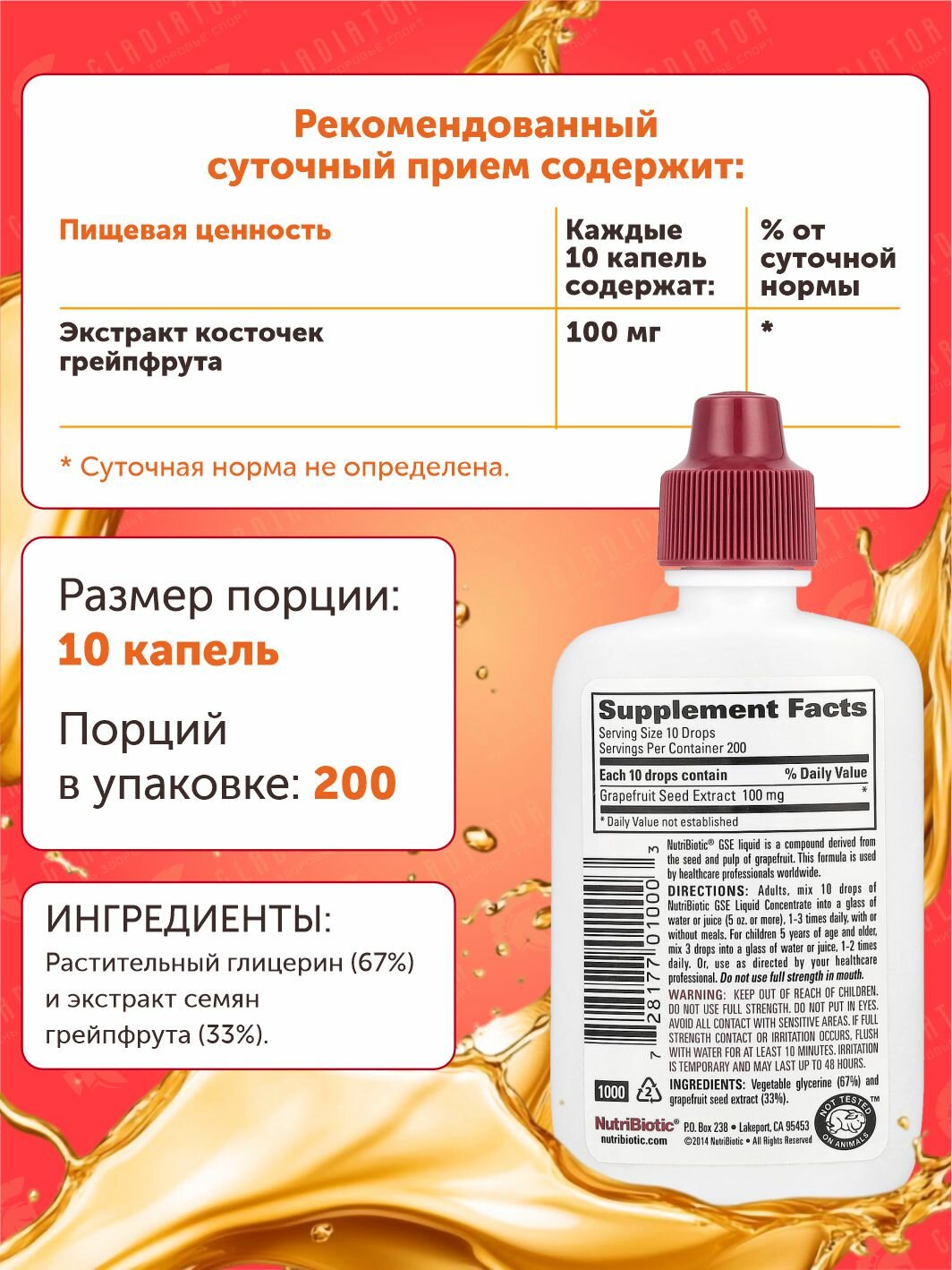 Рекомендации по применениюВзрослые: смешать 10 капель жидкого концентрата NutriBiotic GSE в стакане воды или сока (не менее 150 мл (5 унций)). Принимать 1–3 раза в день независимо от приема пищи. Дети от 5 лет: смешать 3 капли в стакане воды или сока, принимать 1–2 раза в день. Или принимайте в соответствии с рекомендациями врача. Не берите в рот в неразбавленном виде. ПредупрежденияХранить в недоступном для детей месте. Не использовать в неразбавленном виде. Избегать попадания в глаза. Избегать любого контакта с чувствительными участками. В случае контакта с концентратом в неразбавленном виде или при появлении раздражения тщательно промойте водой в течение не менее 10 минут. Раздражение носит временный характер и может длиться до 48 часов. ИнгредиентыРастительный глицерин (67%) и экстракт семян грейпфрута (33%).