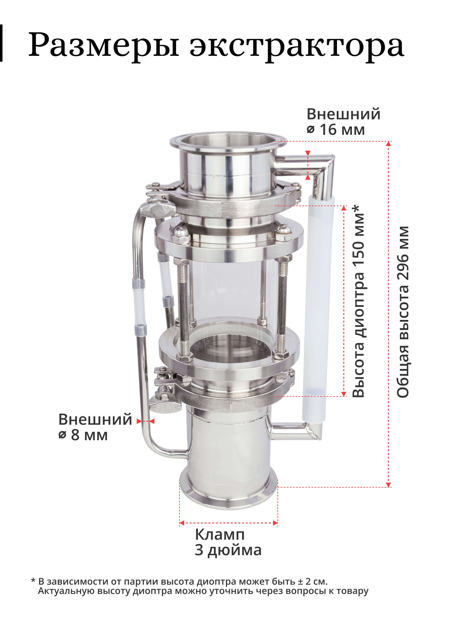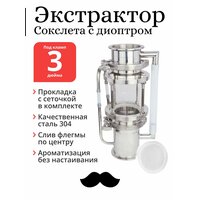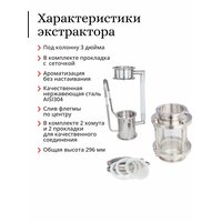 Экстрактор оборудован прокладкой с сеточкой, которая устанавливается под диоптр. Благодаря сетке можно заполнить диоптр необходимым количеством сырья. Можно разобрать и использовать диоптр отдельно.