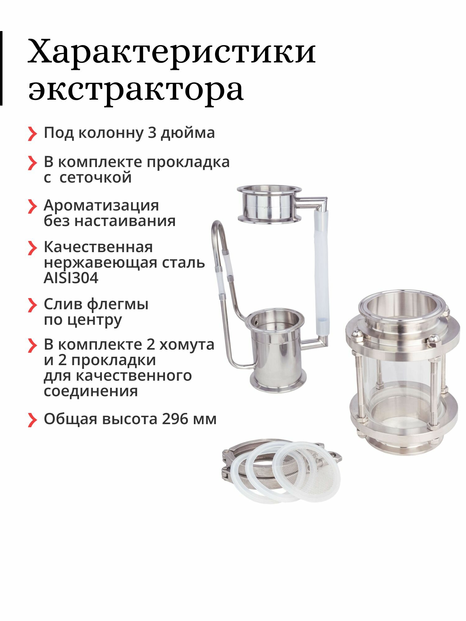 Экстрактор устанавливается на перегонный куб, сверху на него устанавливается дефлегматор.